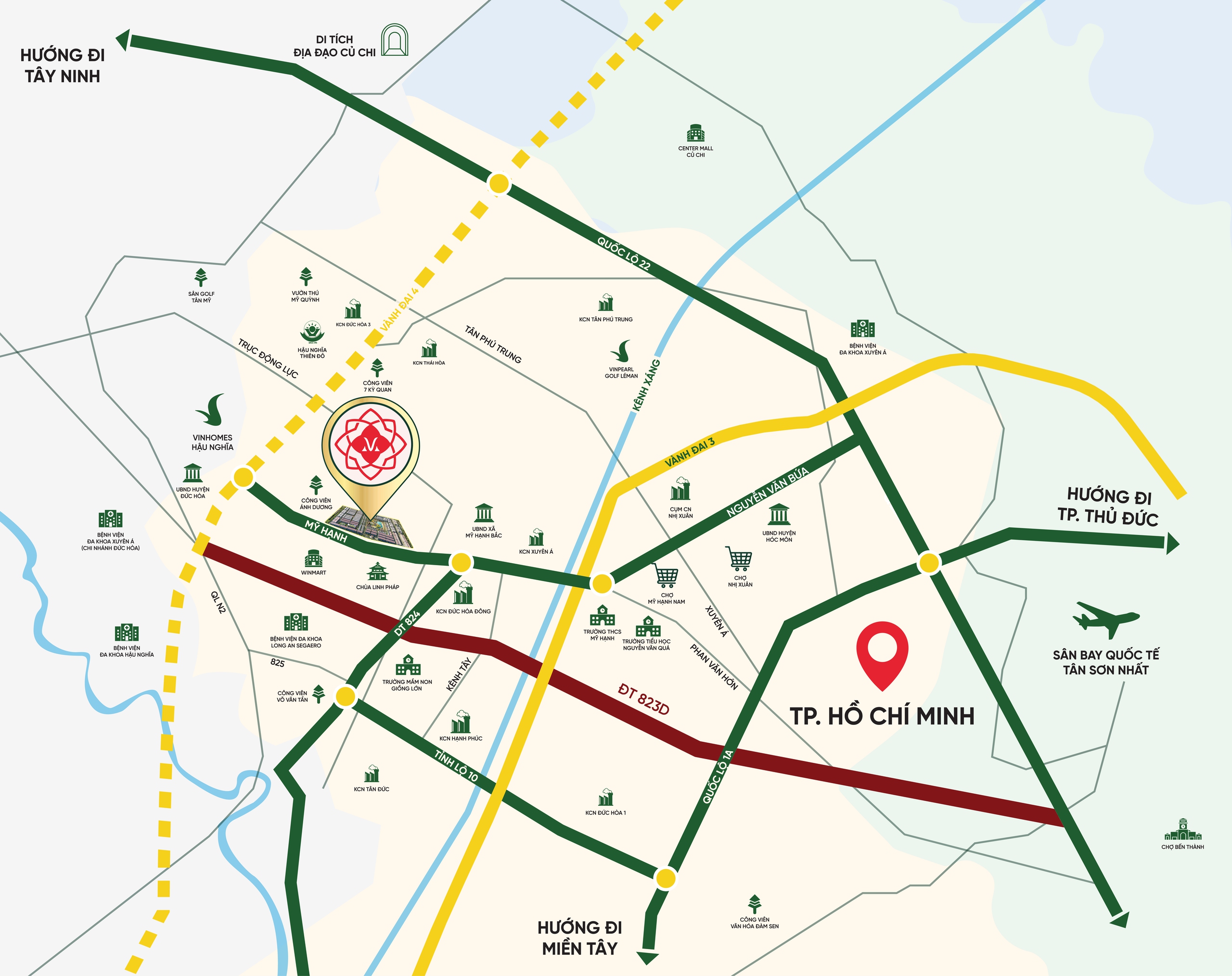 - Vị trí đắc địa liền kề 3 huyện của TP.HCM cũ: Hóc Môn, Bình Chánh và Củ Chi.