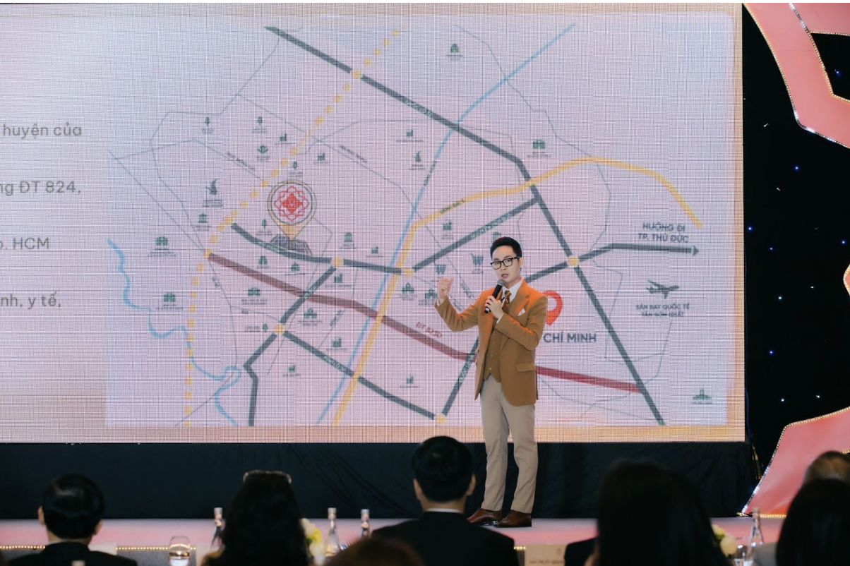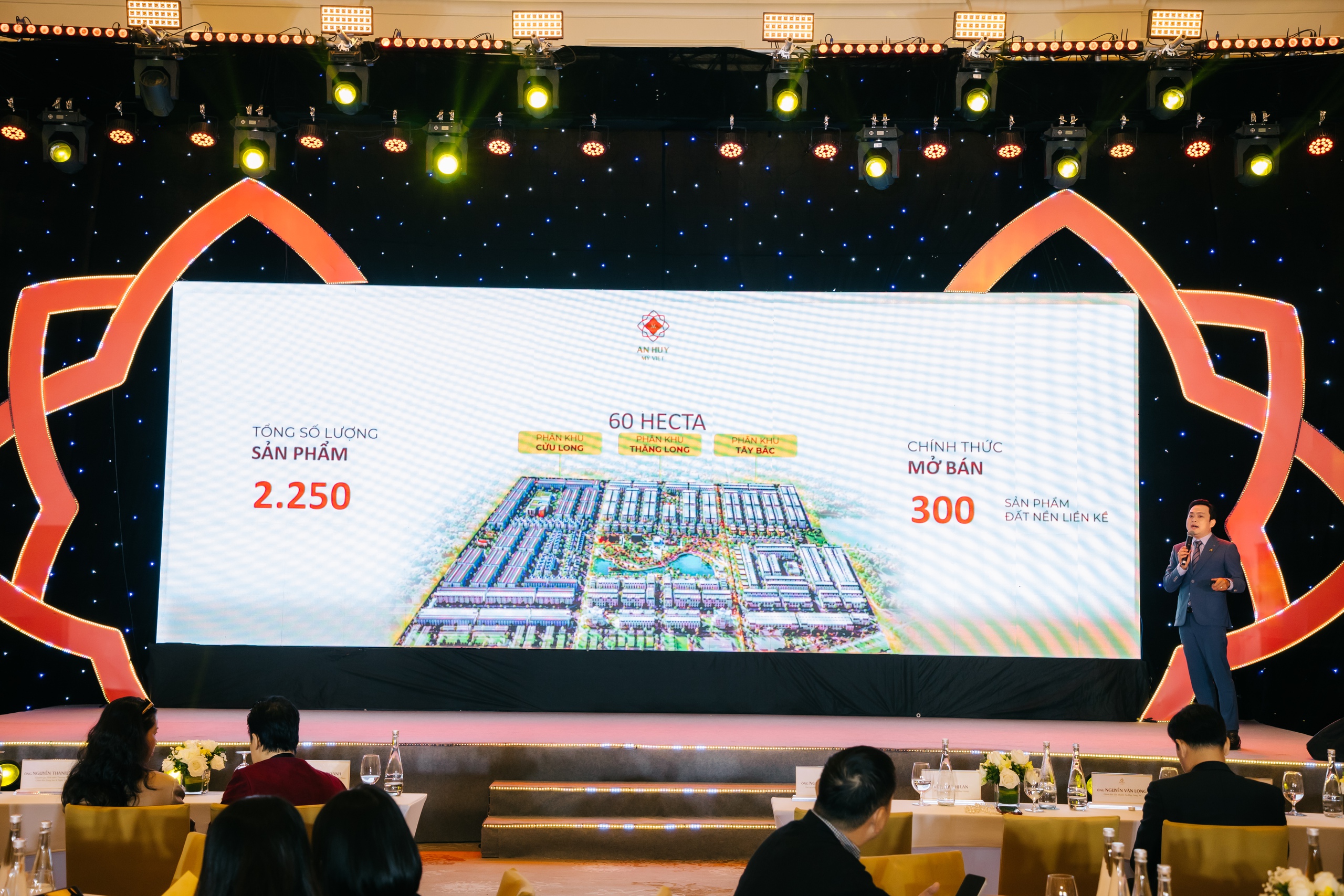 MC Hoài Ân trình bày tổng quan vị trí chiến lược của Khu đô thị An Huy Mỹ Việt tại sự kiện.
