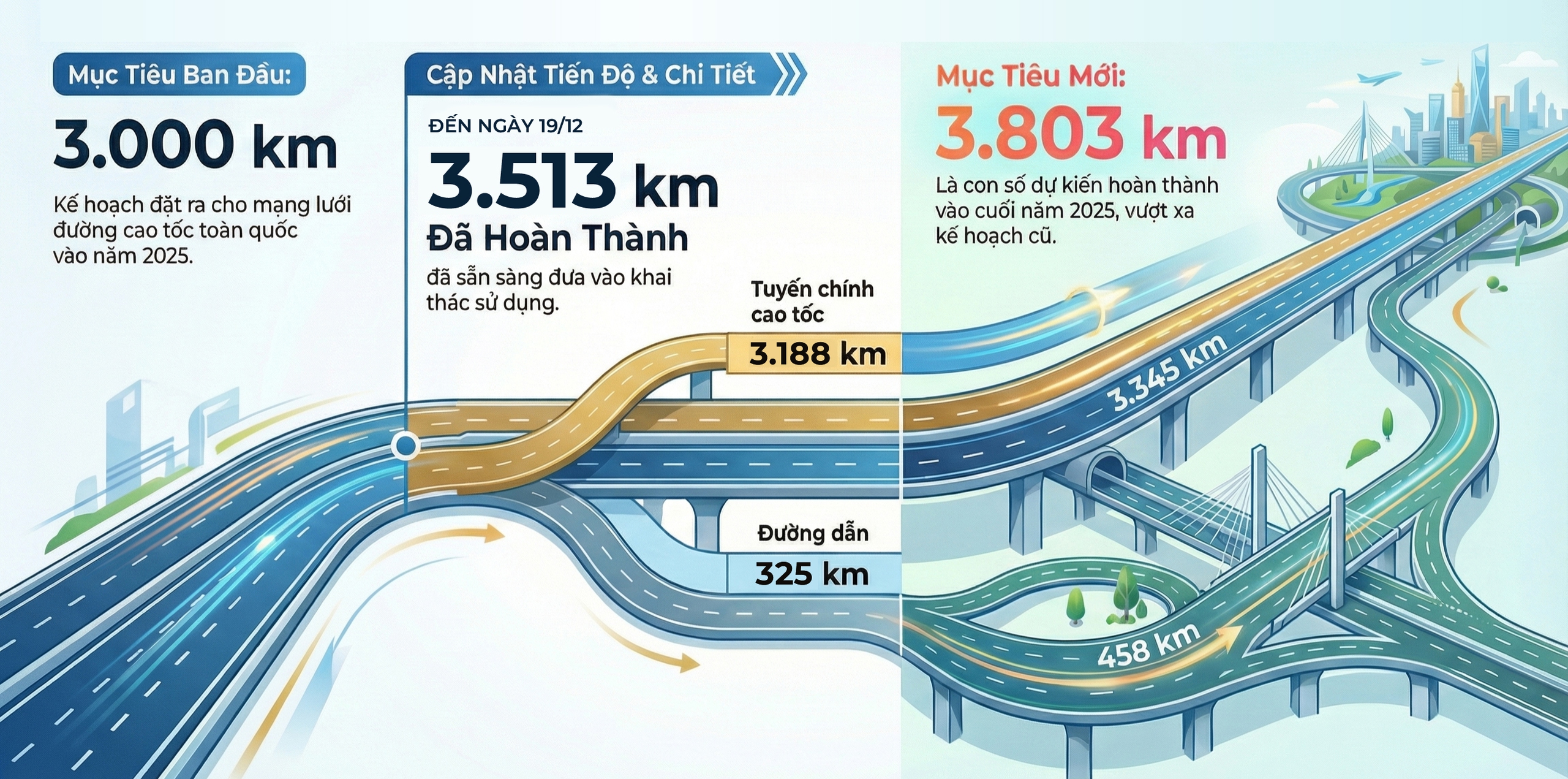 Trên bình diện quốc gia, mục tiêu 3.000km cao tốc vào năm 2025 đã trở thành dấu mốc quan trọng để công trường các dự án sôi nổi hơn, tấp nập hơn với mục tiêu không chỉ đạt mà thậm chí vượt qua con số này. Kết quả, ngày 19/8, cả nước đã hoàn thành, đưa vào khai thác 2.620km cao tốc gồm 2.476km tuyến chính và 144km đường dẫn. Đến ngày 19/12/2025, số km đã hoàn thành, thông xe kỹ thuật là 3.513km với 3.188km tuyến chính cao tốc, 325km nút giao, đường dẫn. Và đến hết năm 2025, cả nước sẽ hoàn thành 3.803km gồm 3.345km tuyến chính cao tốc, 458km đường dẫn. Những con số này cũng chứng minh, Việt Nam đang lần đầu tiên tiến rất gần tới một mạng lưới cao tốc liên vùng đủ lớn, tạo sức bật cho thị trường bất động sản ở nhiều địa phương, thay vì chỉ tập trung vào một vài đô thị trọng điểm.