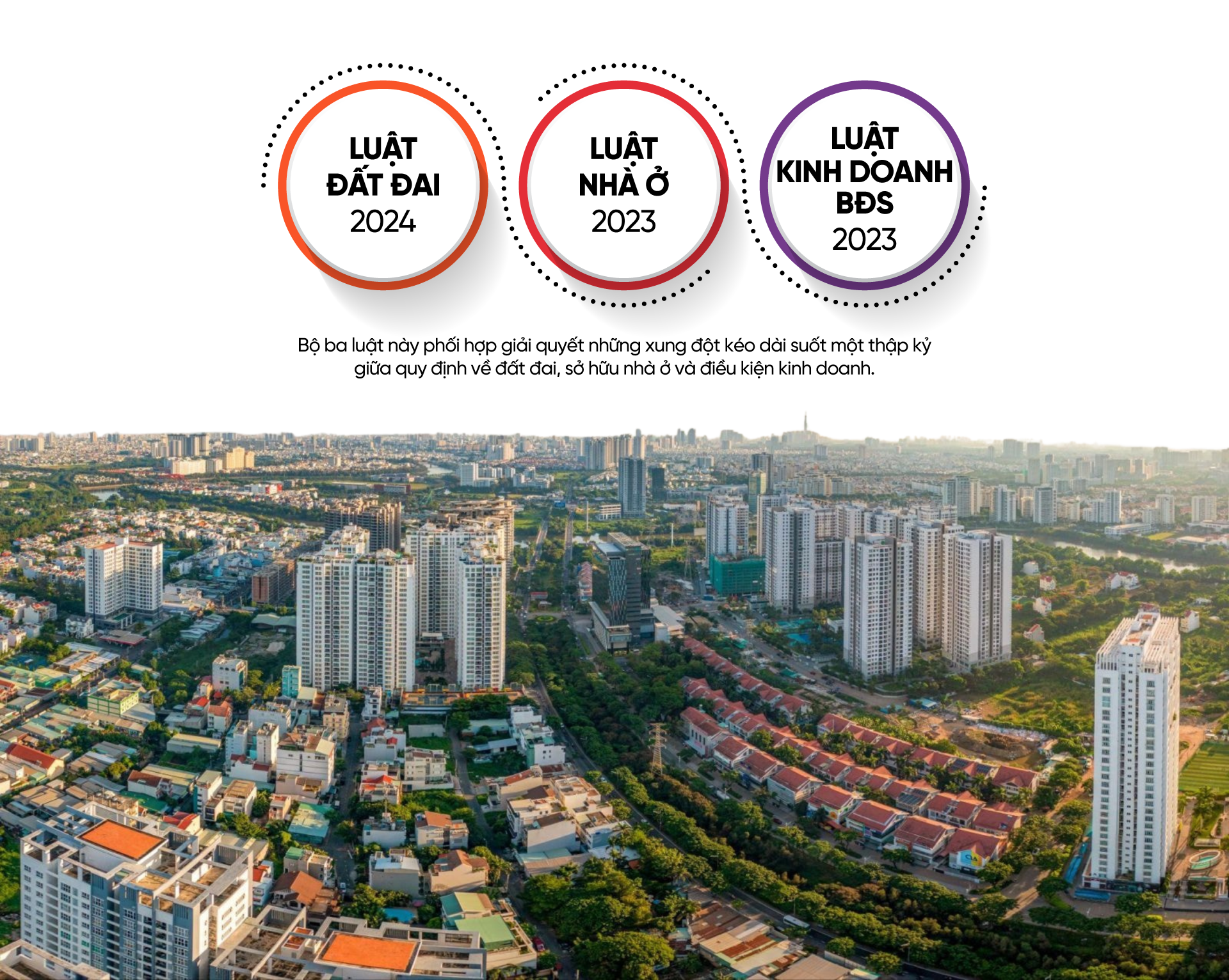 Trọng tâm lớn nhất là "siêu chu kỳ pháp lý" với ba đạo luật trụ cột: Luật Đất đai 2024, Luật Nhà ở 2023 và Luật Kinh doanh bất động sản 2023 đồng loạt triển khai và bắt đầu "ngấm" vào thị trường. Bộ ba luật này phối hợp giải quyết những xung đột kéo dài suốt một thập kỷ giữa quy định về đất đai, sở hữu nhà ở và điều kiện kinh doanh.