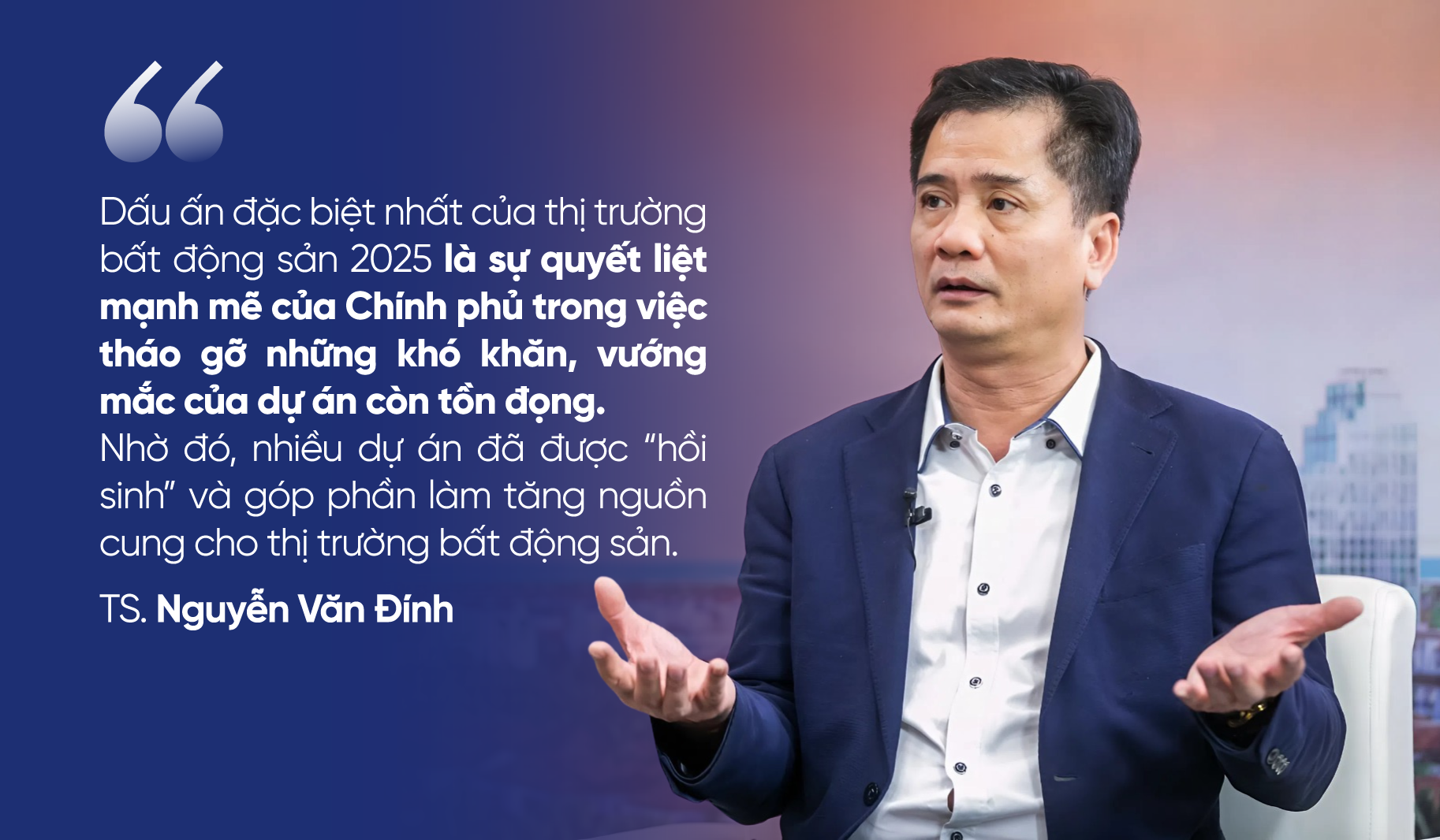 "Dấu ấn đặc biệt nhất của thị trường bất động sản 2025 là sự quyết liệt mạnh mẽ của Chính phủ trong việc tháo gỡ những khó khăn, vướng mắc của dự án còn tồn đọng. Nhờ đó, nhiều dự án đã được "hồi sinh" và góp phần làm tăng nguồn cung cho thị trường bất động sản", TS. Nguyễn Văn Đính nhận định.