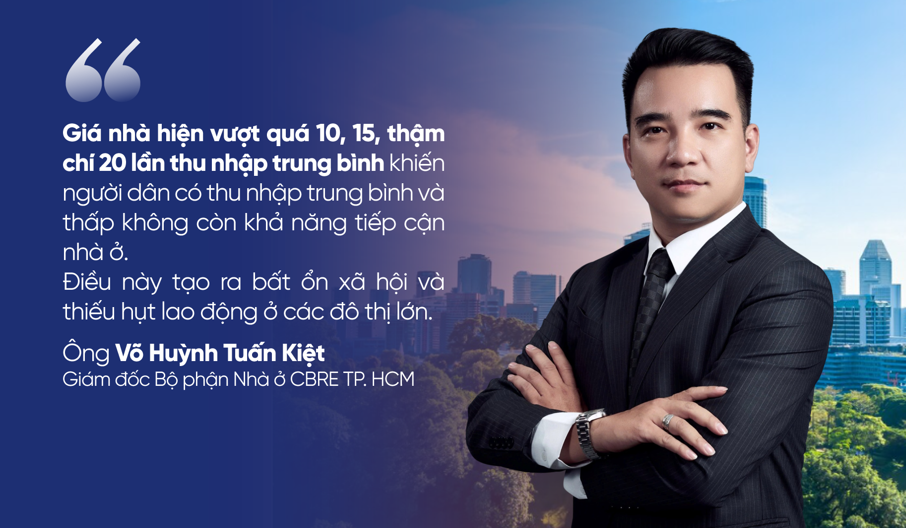 "Giá nhà hiện vượt quá 10, 15, thậm chí 20 lần thu nhập trung bình khiến người dân có thu nhập trung bình và thấp không còn khả năng tiếp cận nhà ở. Điều này tạo ra bất ổn xã hội và thiếu hụt lao động ở các đô thị lớn", Ông Võ Huỳnh Tuấn Kiệt - Giám đốc Bộ phận Nhà ở CBRE TP. HCM nhận định.