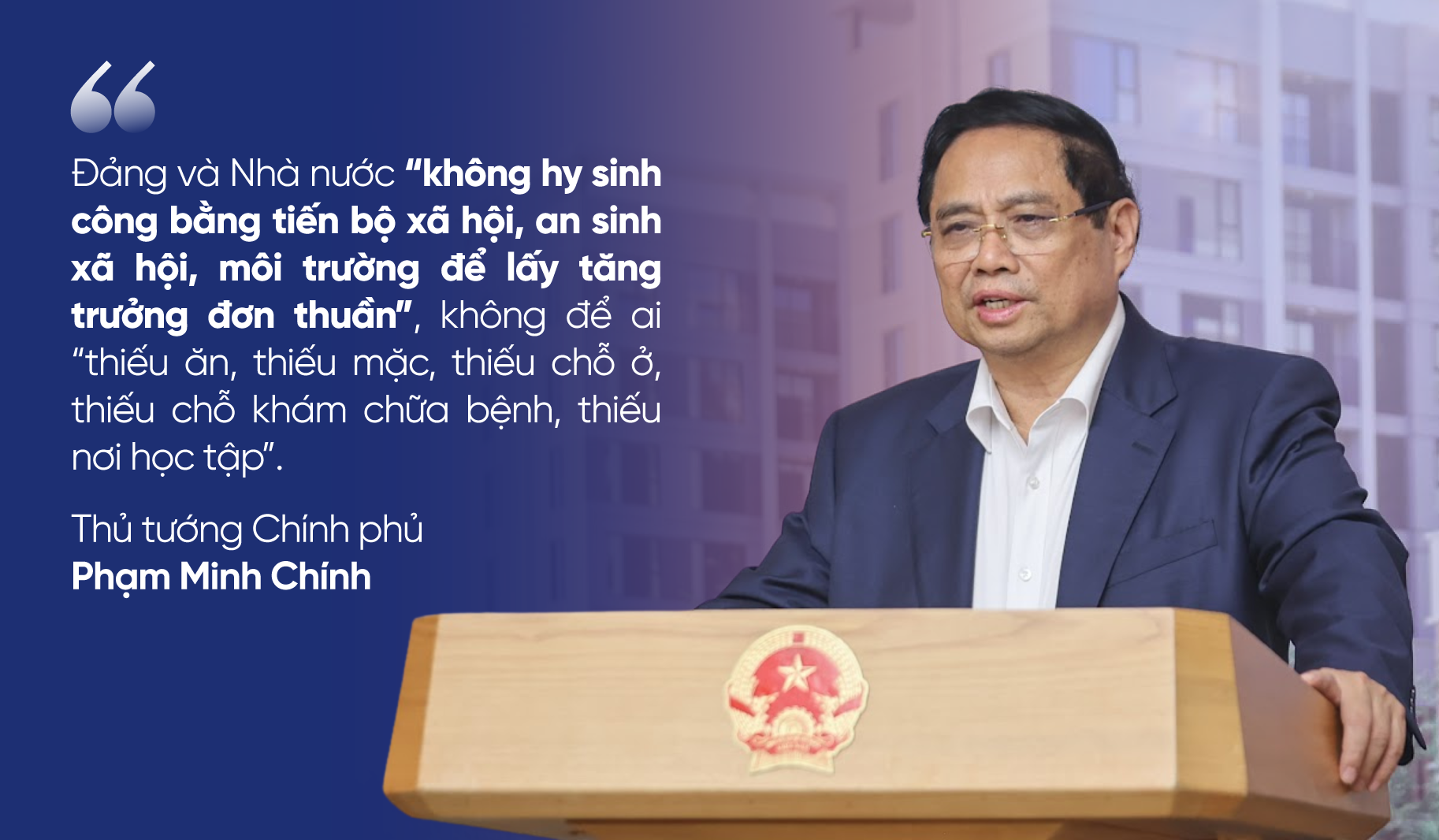 Tại Hội nghị sơ kết chỉ tiêu NOXH ngày 16/8, Thủ tướng Phạm Minh Chính nhấn mạnh quan điểm xuyên suốt: Đảng và Nhà nước "không hy sinh công bằng tiến bộ xã hội, an sinh xã hội, môi trường để lấy tăng trưởng đơn thuần", không để ai "thiếu ăn, thiếu mặc, thiếu chỗ ở, thiếu chỗ khám chữa bệnh, thiếu nơi học tập". Trong logic phát triển đó, bảo đảm chỗ ở, nhất là cho người thu nhập thấp, công nhân khu công nghiệp, cán bộ công chức khó khăn về nhà ở được xếp vào nhóm "vấn đề lớn", trở thành một ưu tiên mang tính chiến lược.