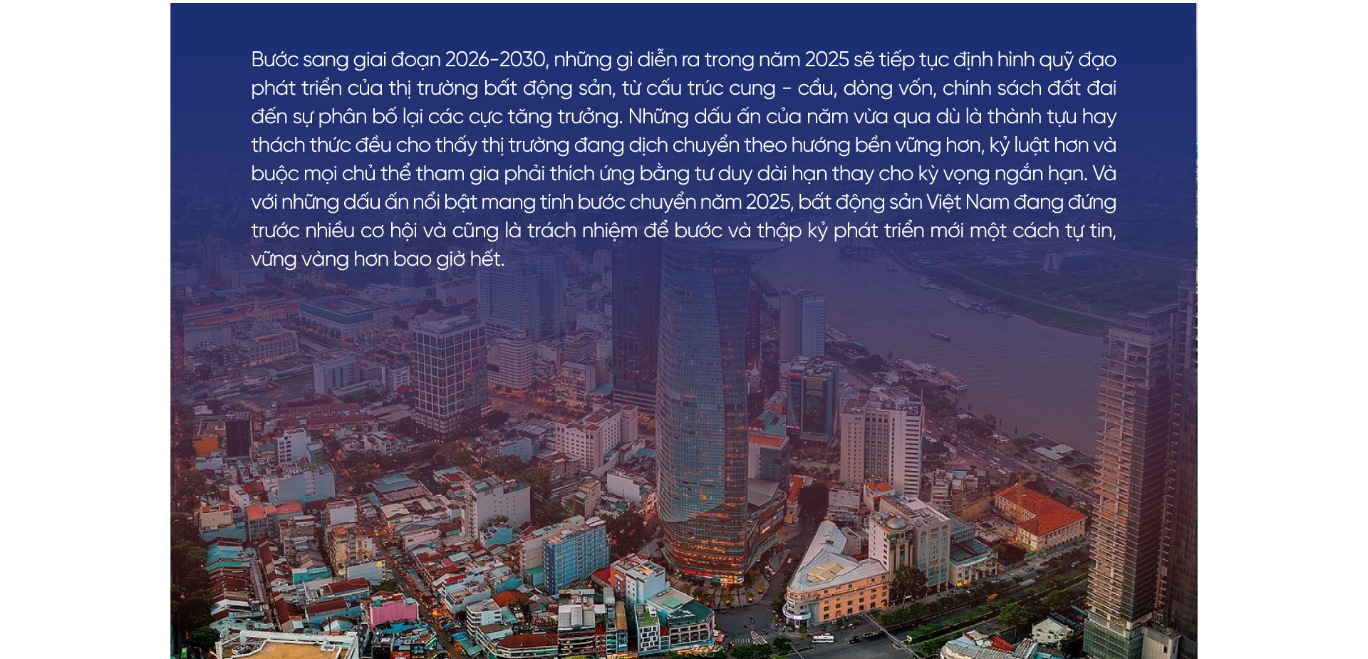 2025 không chỉ là năm của phục hồi, mà còn là năm của tái cấu trúc toàn diện. Từ nhà ở đến công nghiệp - logistics, từ thị trường giá cao đến phân khúc an sinh, từ hạ tầng giao thông đến cải cách đơn vị hành chính, mọi chuyển động đều cho thấy một "quy luật mới" đang hình thành. Đây là giai đoạn thị trường được thử thách, thanh lọc và buộc phải trưởng thành hơn, minh bạch hơn, chuyên nghiệp hơn. Đồng thời, cũng là thời điểm mở ra một chu kỳ phát triển mới, nơi những trụ cột quan trọng nhất của thị trường được định vị lại để phù hợp với yêu cầu của một nền kinh tế quy mô lớn và hội nhập sâu hơn vào chuỗi giá trị toàn cầu.