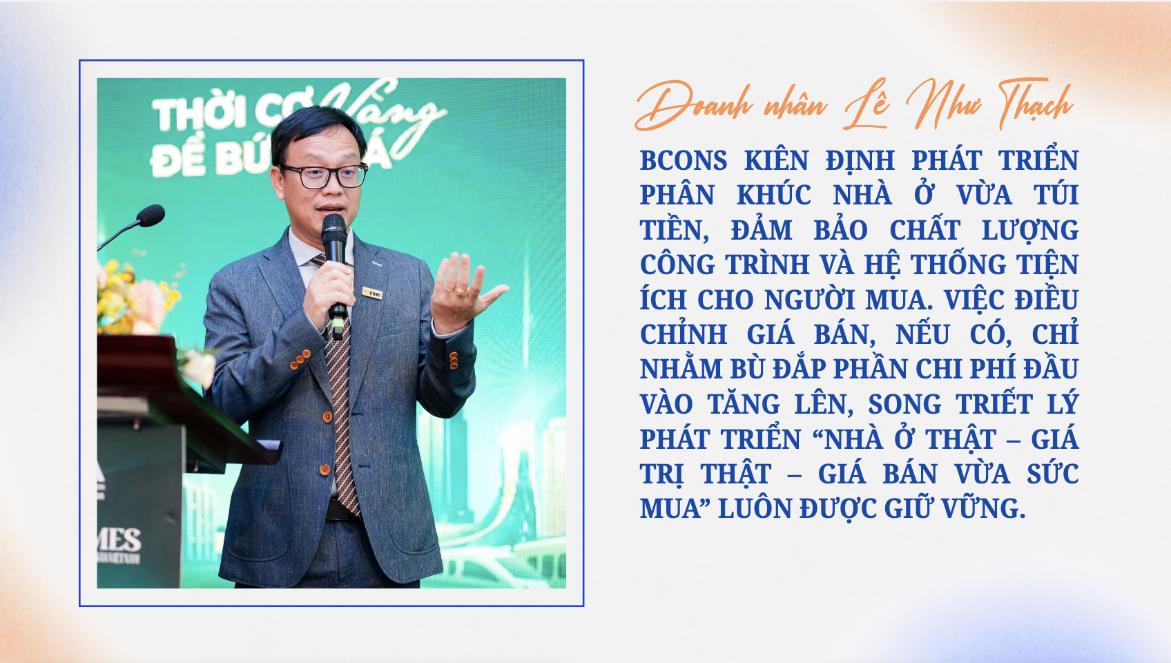 Dù chi phí đầu vào tăng cao, Bcons vẫn kiên định phát triển phân khúc nhà ở vừa túi tiền, đảm bảo chất lượng công trình và hệ thống tiện ích cho người mua. Việc điều chỉnh giá bán, nếu có, chỉ nhằm bù đắp phần chi phí đầu vào tăng lên, song triết lý phát triển "nhà ở thật – giá trị thật – giá bán vừa sức mua" luôn được giữ vững.