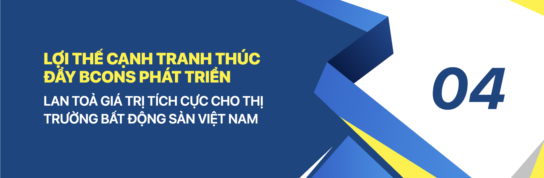 Yếu tố đóng góp vào sự phát triển bền vững của doanh nghiệp, đó là sức mạnh và khả năng cạnh tranh của Bcons đến từ sự kết hợp của nhiều yếu tố. Đó là quá trình hơn 12 năm nỗ lực trong việc giữ vững chữ Tín với khách hàng và đối tác để mang đến sự chuẩn chỉnh về mặt pháp lý cũng như tiến độ thi công luôn được đảm bảo, chất lượng sản phẩm tốt với mức giá cạnh tranh, phù hợp với người lao động có mức thu nhập tầm trung, cùng đội ngũ cán bộ, nhân viên sáng tạo, tâm huyết và xây dựng được hệ sinh thái đối tác hợp tác cùng phát triển uy tín, chuyên nghiệp,…