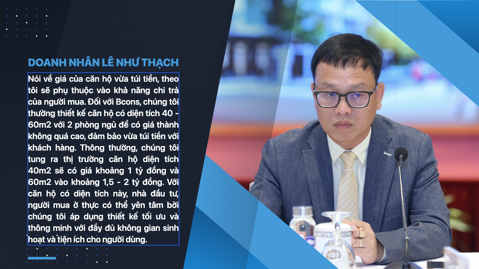 Chia sẻ về câu chuyện "Nhà ở giá trị thực" - Niềm tin và kỳ vọng của thị trường, ông Lê Như Thạch, Chủ tịch HĐQT Tập đoàn Bcons cho biết, thời gian qua, Tập đoàn Bcons đã phát triển 20.000 căn hộ với các dự án tiêu biểu như Bcons Garden, Bcons Green View, Bcons Avenue, Bcons Polaris, Bcons Eden Park và Bcons City. Mỗi công trình đều thể hiện triết lý "Kiến tạo giá trị thật" – hướng đến không gian sống bền vững, nhân văn và tiện nghi cho người dân. Thời gian tới, doanh nghiệp đang tiếp tục xây dựng 20.000 căn hộ bổ sung cho thị trường.