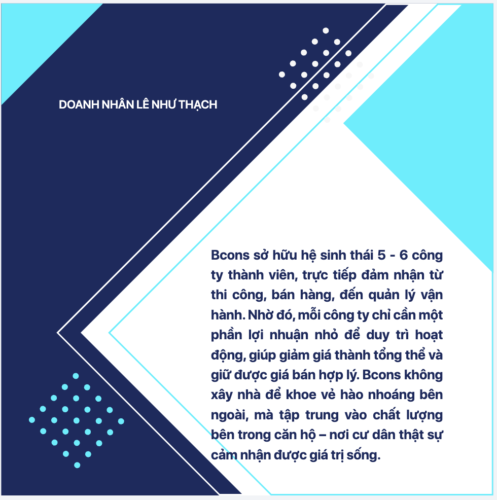 Hiện nay, Tập đoàn Bcons đang sở hữu hệ sinh thái gồm 5–6 công ty thành viên đảm nhiệm toàn bộ quy trình từ thi công, bán hàng đến quản lý vận hành, giúp tối ưu chi phí và duy trì giá bán hợp lý. Bcons không tập trung vào việc phô trương vẻ ngoài của công trình, mà chú trọng vào chất lượng bên trong căn hộ, nơi cư dân có thể thực sự cảm nhận được giá trị sống bền vững mà doanh nghiệp hướng tới.
