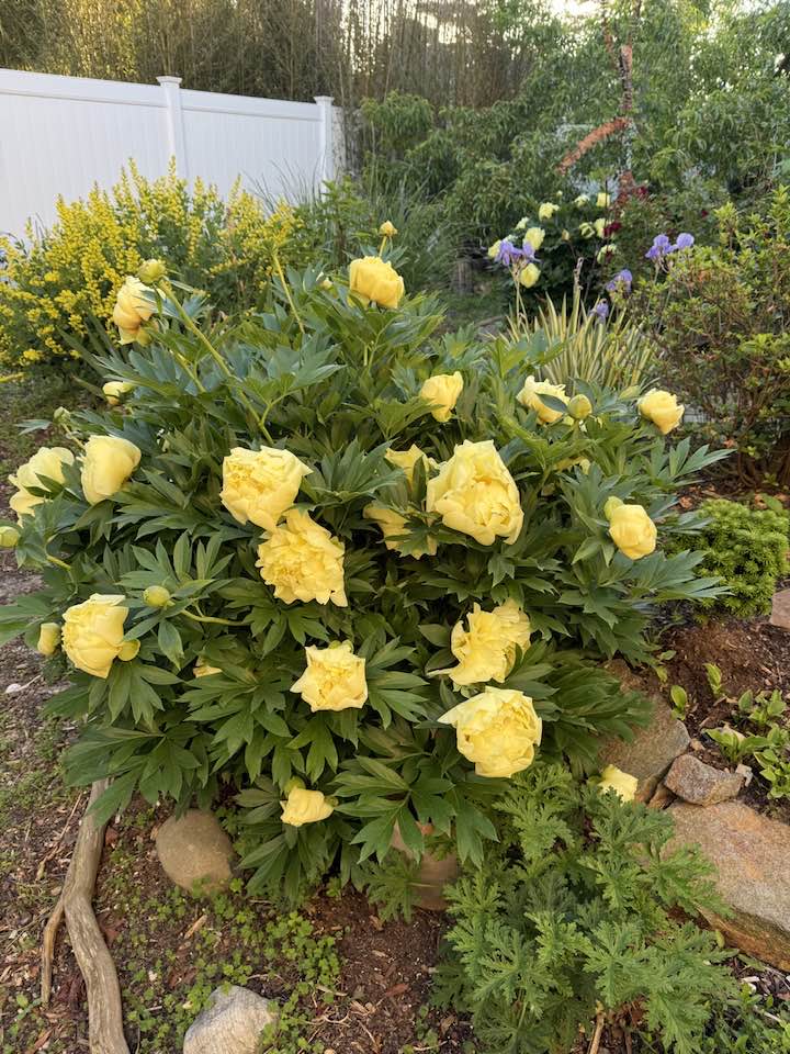 Góc vườn còn rực rỡ hơn với hoa mẫu đơn vàng - biểu tượng của phú quý, giàu sang nở thành cụm lớn, tươi tắn dưới ánh nắng đầu hè. Mẫu đơn ưa đất thịt nhẹ, thoát nước tốt và cần nhiều nắng để giữ sắc hoa bền lâu.