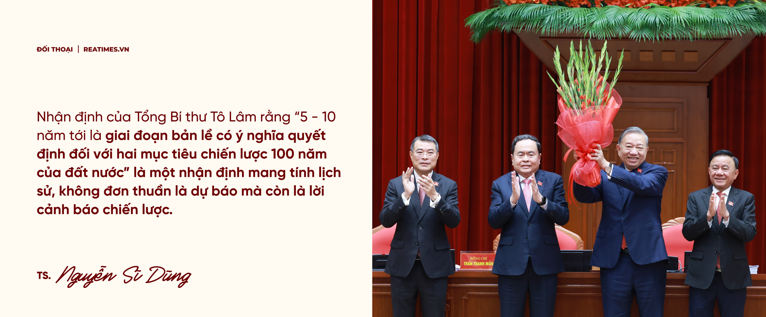 - Thưa tiến sĩ Nguyễn Sĩ Dũng, trong bài viết: "Tiến lên! Toàn thắng ắt về ta!", Tổng Bí thư Tô Lâm khẳng định: "Nghị quyết Đại hội XIV đề ra mục tiêu tổng quát cho giai đoạn 2026 - 2030 và tầm nhìn đến 2045 hết sức rõ ràng, táo bạo nhưng khả thi: Giữ vững môi trường hòa bình, ổn định; phát triển đất nước nhanh và bền vững; nâng cao toàn diện đời sống Nhân dân; tăng cường tự chủ, tự cường để tiến mạnh trong kỷ nguyên mới của dân tộc". Ông đánh giá như thế nào về khát vọng phát triển đã được xác lập của Đảng và của dân tộc?