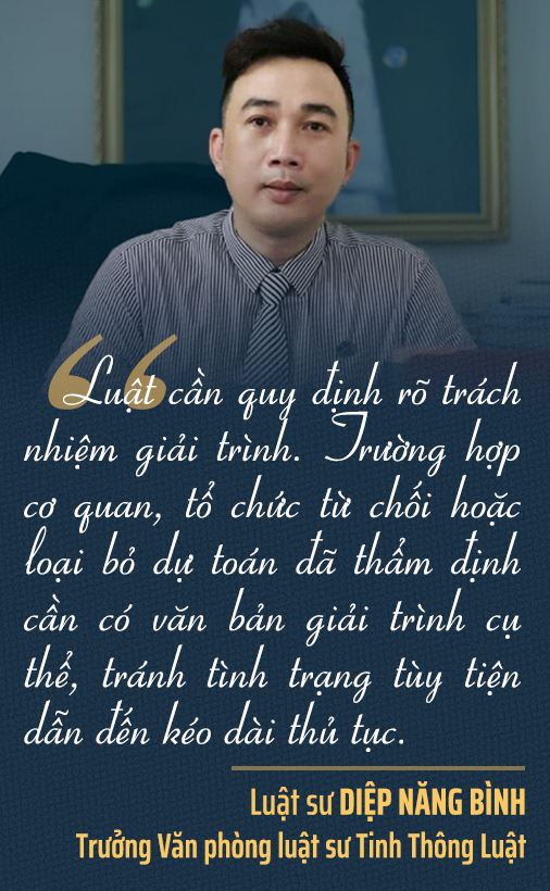 Luật sư Diệp Năng Bình bổ sung thêm: "Luật cần quy định rõ trách nhiệm giải trình. Trường hợp cơ quan, tổ chức từ chối hoặc loại bỏ dự toán đã thẩm định của đơn vị tư vấn thì cần có văn bản giải trình cụ thể, tránh tình trạng tùy tiện dẫn đến kéo dài thủ tục",