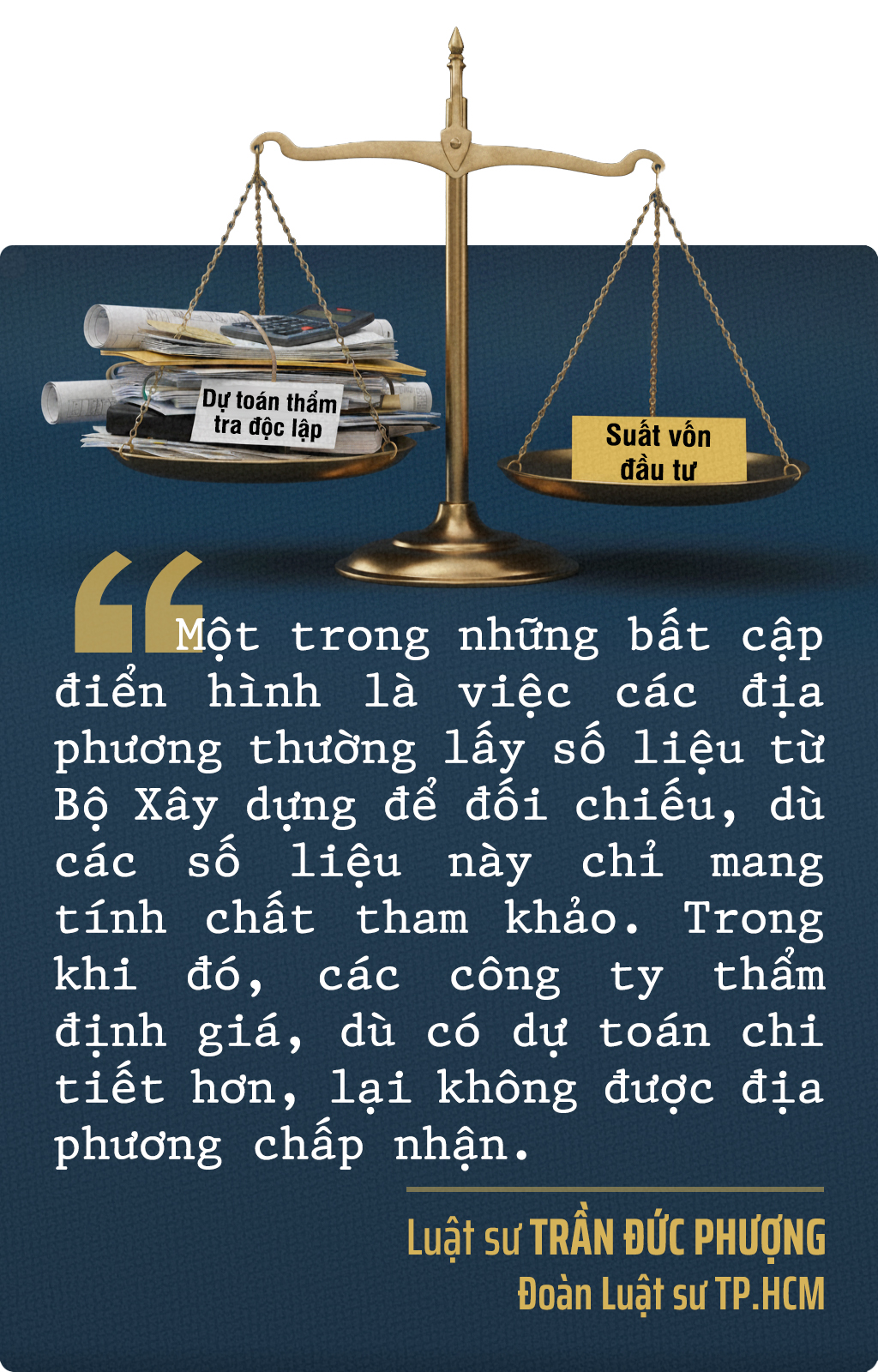 "Doanh nghiệp thì phải tuân thủ, nhưng lại không biết căn cứ nào mới là "chuẩn mực" cuối cùng. Hội đồng thẩm định giá đất cấp tỉnh cũng lúng túng, bởi việc lựa chọn giữa "suất vốn đầu tư công bố" và "dự toán thẩm tra độc lập" dễ dẫn đến tình trạng suy đoán, thậm chí gây rủi ro pháp lý cho chính người ký duyệt", luật sư Tú phân tích.