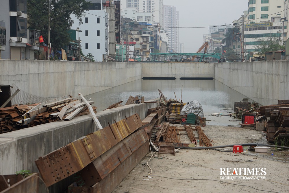 Xung quanh khu vực hầm chui (phía Đầm Hồng) hiện nay vẫn ngổn ngang đất đá, vật liệu xây dựng...