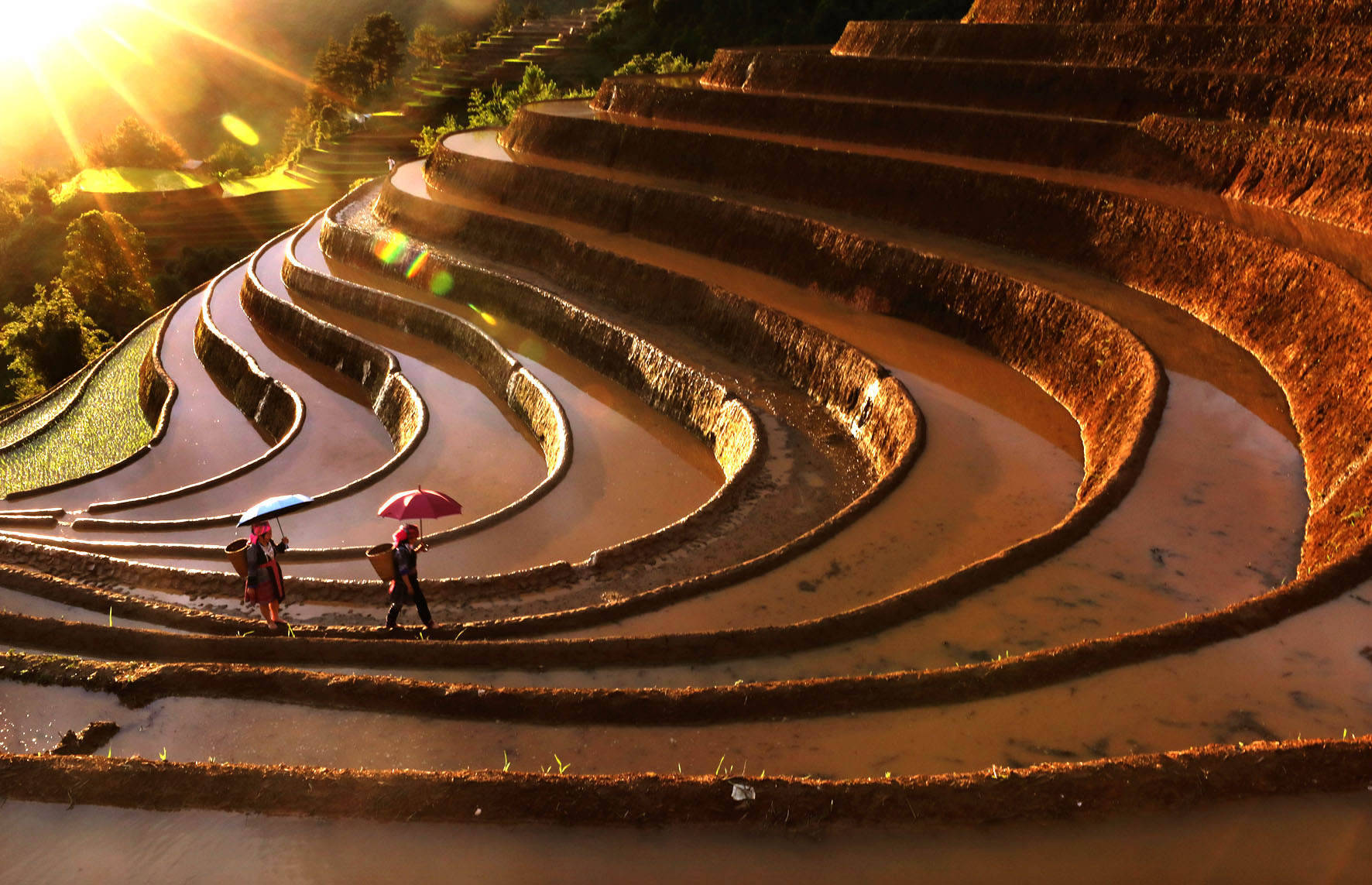 Trong ánh chiều tà, bóng dáng người phụ nữ cùng chiếc lu cở hòa quyện vào những đường cong của ruộng bậc thang, tạo nên một bức tranh lao động tuyệt mỹ.