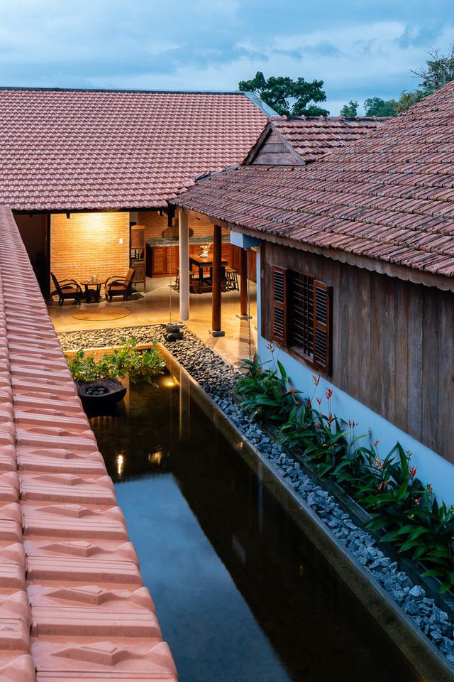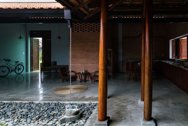 Nhà được quây quanh bởi một hồ nước. Rồi hồ nước cũng được đặt ở sân trong giữa nhà