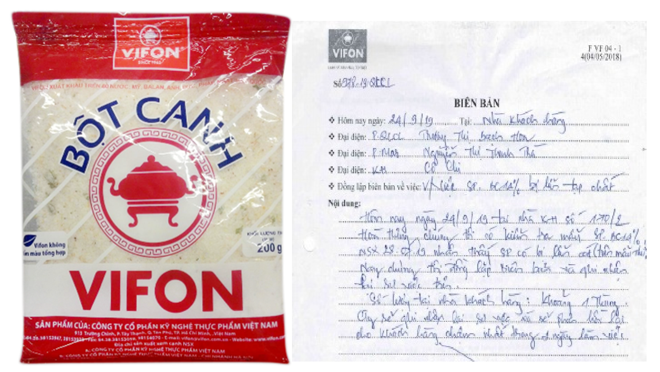Mới đây, một khách hàng quen thuộc của Vifon, bà K.T. Chi (Hòa Hưng, phường 13, quận 10, TP.HCM) đã phản ánh, phát hiện trong gói bột canh thường dùng có “dị vật” lạ không tan giống như sạn, cát màu trắng lắng lại phía dưới. Ngay sau khi phát hiện, bà đã liên hệ với Vifon và công ty này đã đưa mẫu thử và cả lô hàng tại nhà bà Chi để gửi đi phân tích.