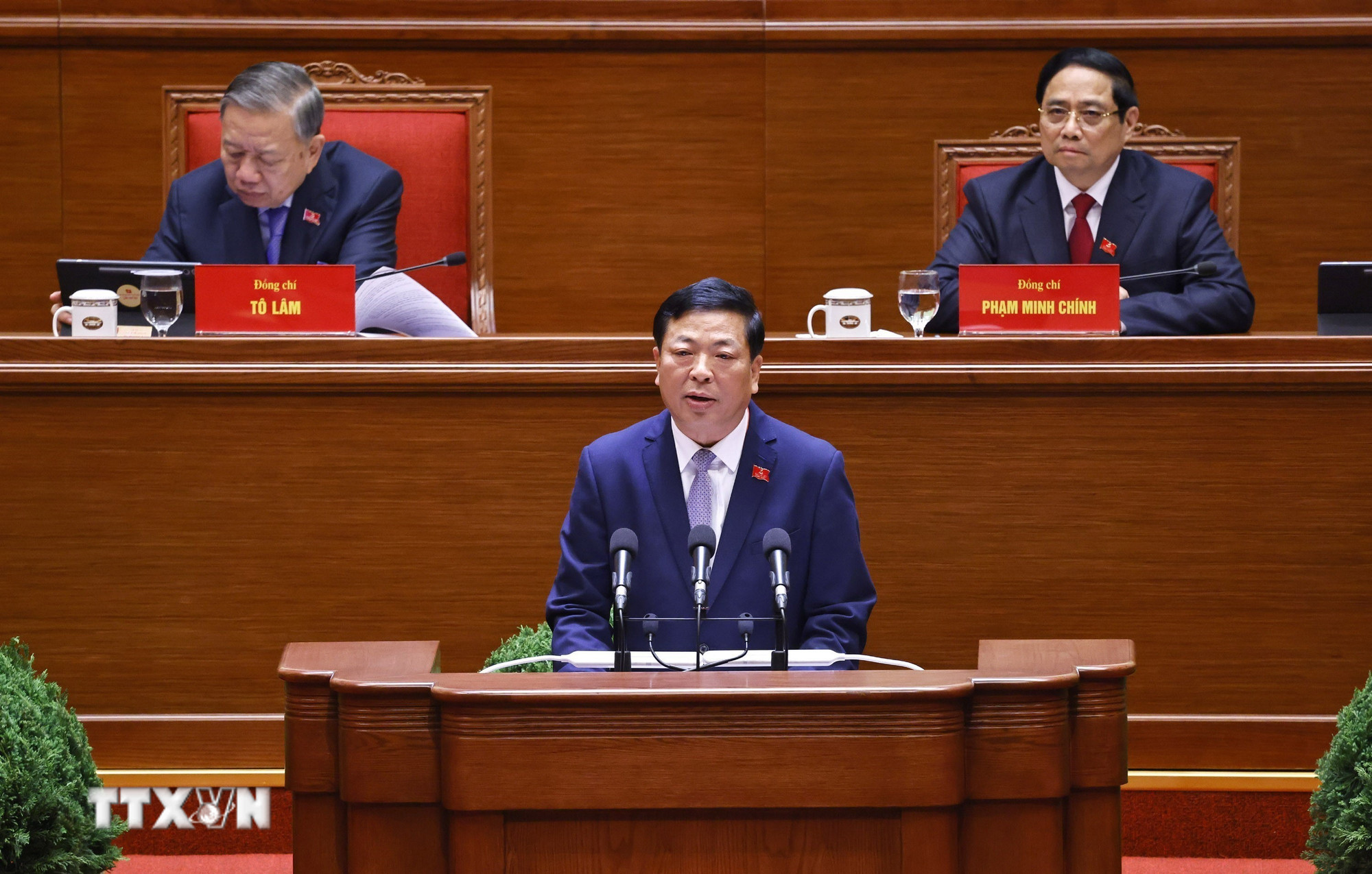 Đồng chí Trần Hồng Minh, Ủy viên Trung ương Đảng, Bí thư Đảng ủy, Bộ trưởng Bộ Xây dựng, tham luận về vấn đề “Đột phá mạnh mẽ phát triển kết cấu hạ tầng trong kỷ nguyên mới. (Ảnh: TTXVN)
