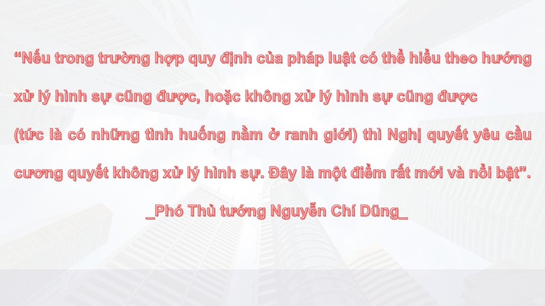 Một nội dung cũng rất quan trọng là, nếu trong trường hợp quy định của pháp luật có thể hiểu theo hướng xử lý hình sự cũng được, hoặc không xử lý hình sự cũng được (tức là có những tình huống nằm ở ranh giới) thì Nghị quyết yêu cầu cương quyết không xử lý hình sự. Đây là một điểm rất mới và rất nổi bật.