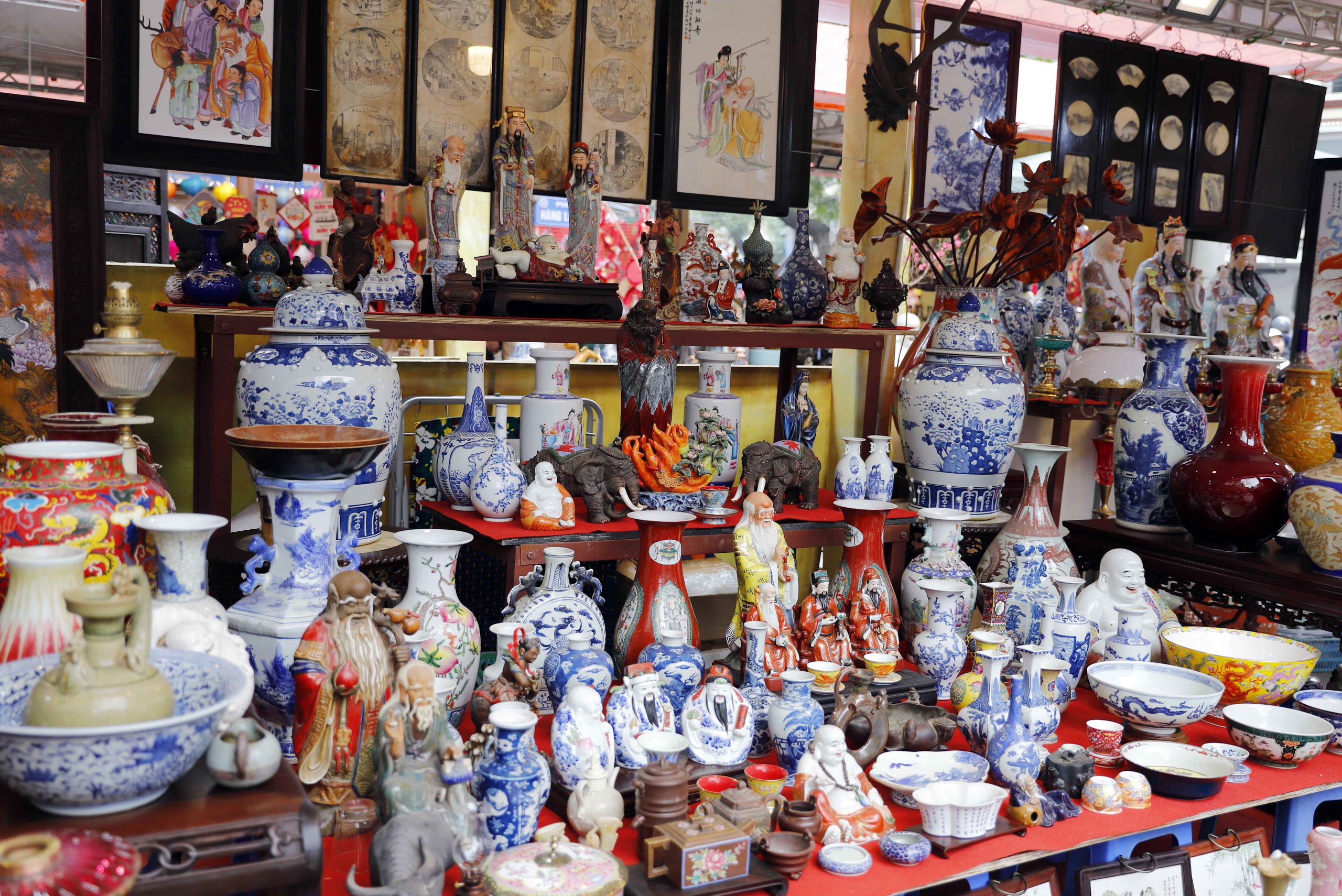 Tượng 3 ông Phúc - Lộc - Thọ được bày bán khiến du khách có cảm giác như đi trong một triển lãm cổ vật, với những món đồ cũ, đồ cổ hàng trăm năm tuổi.
