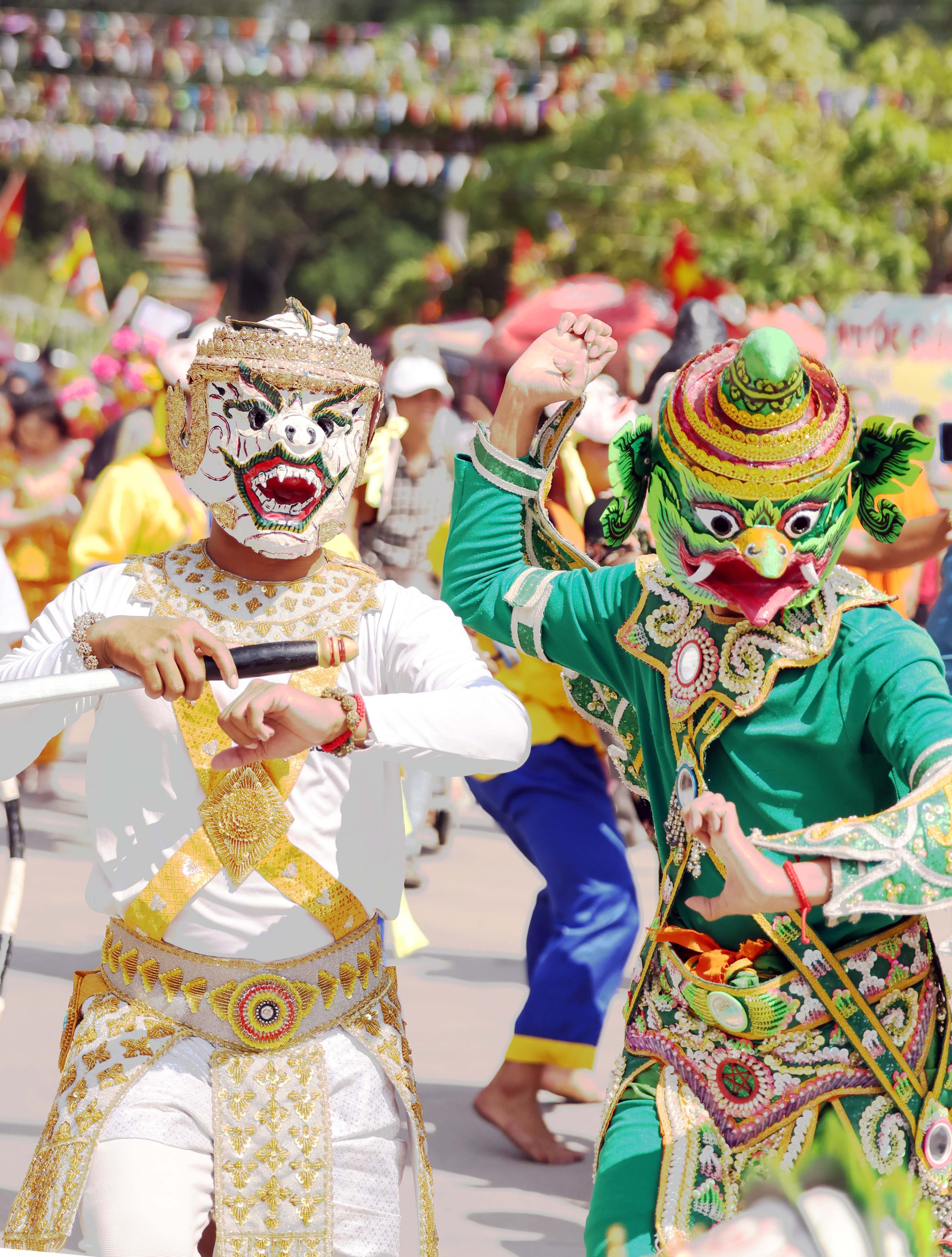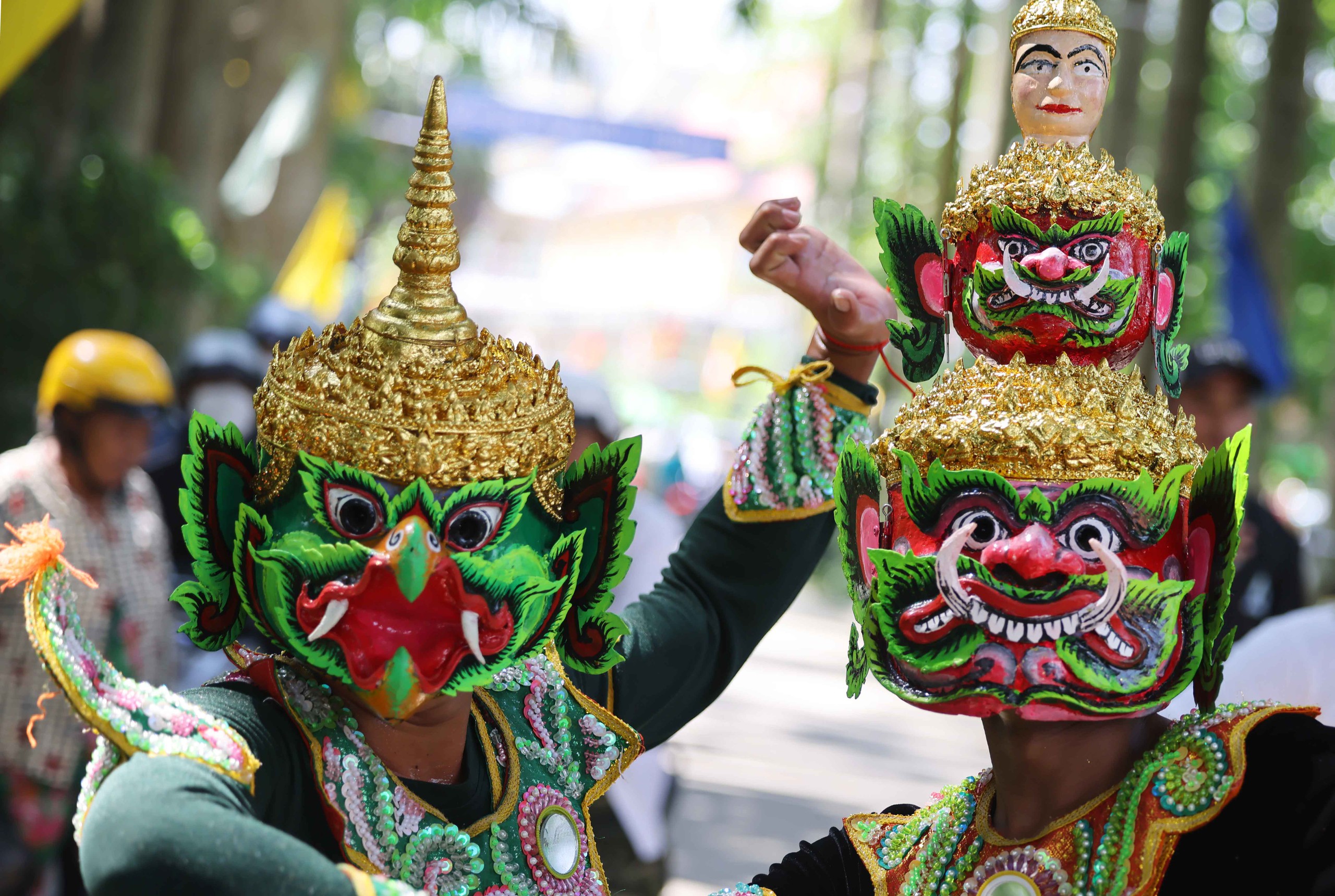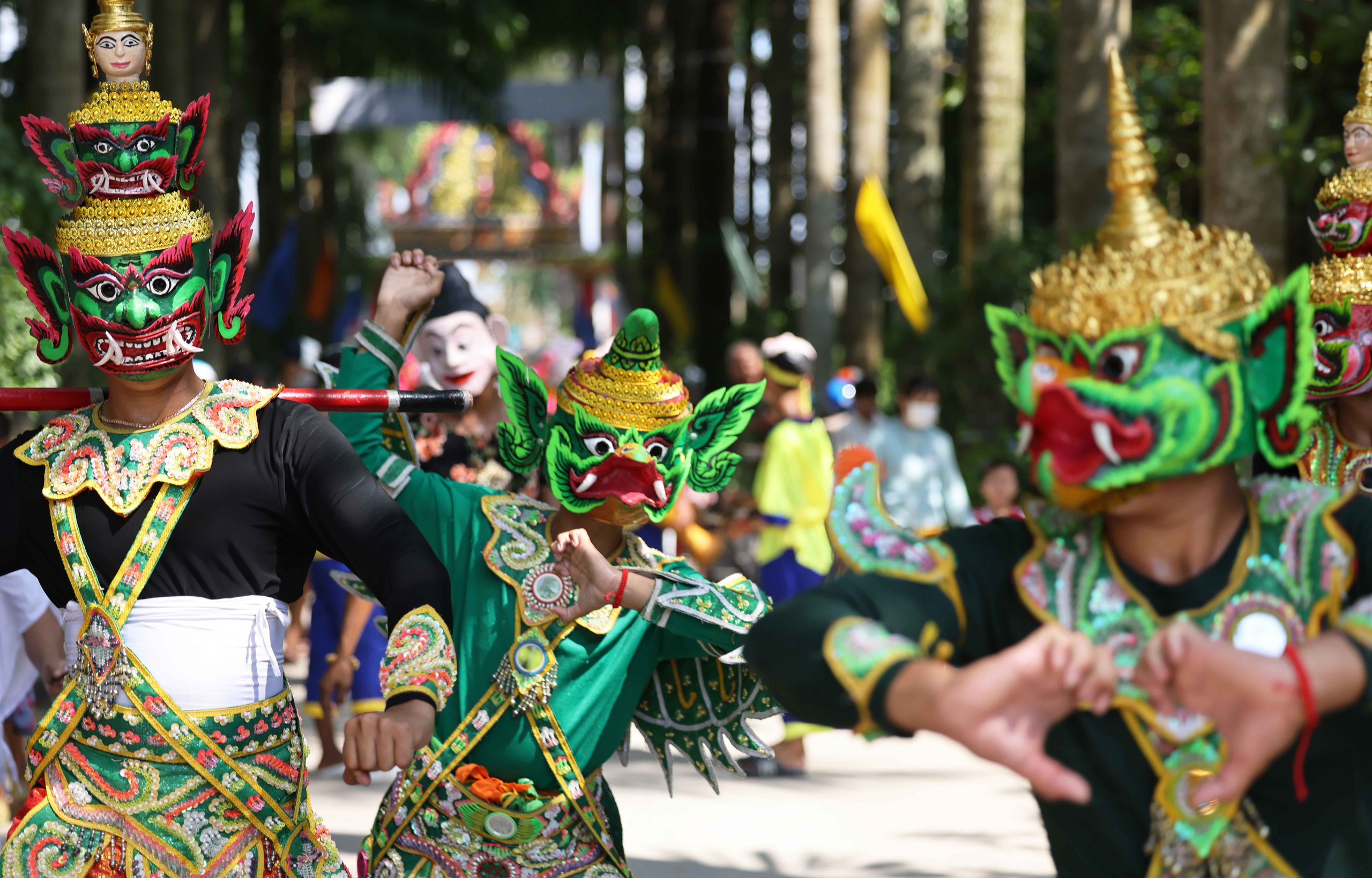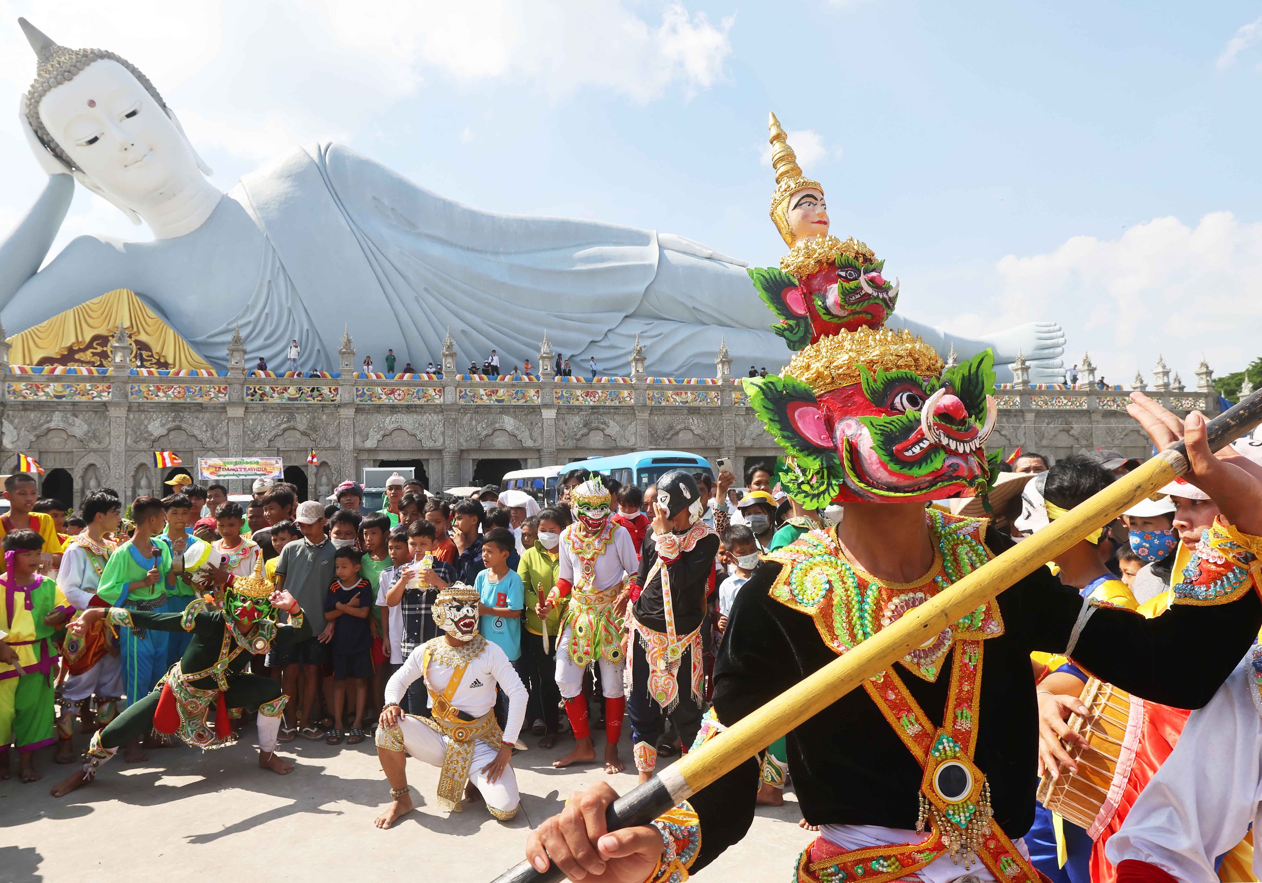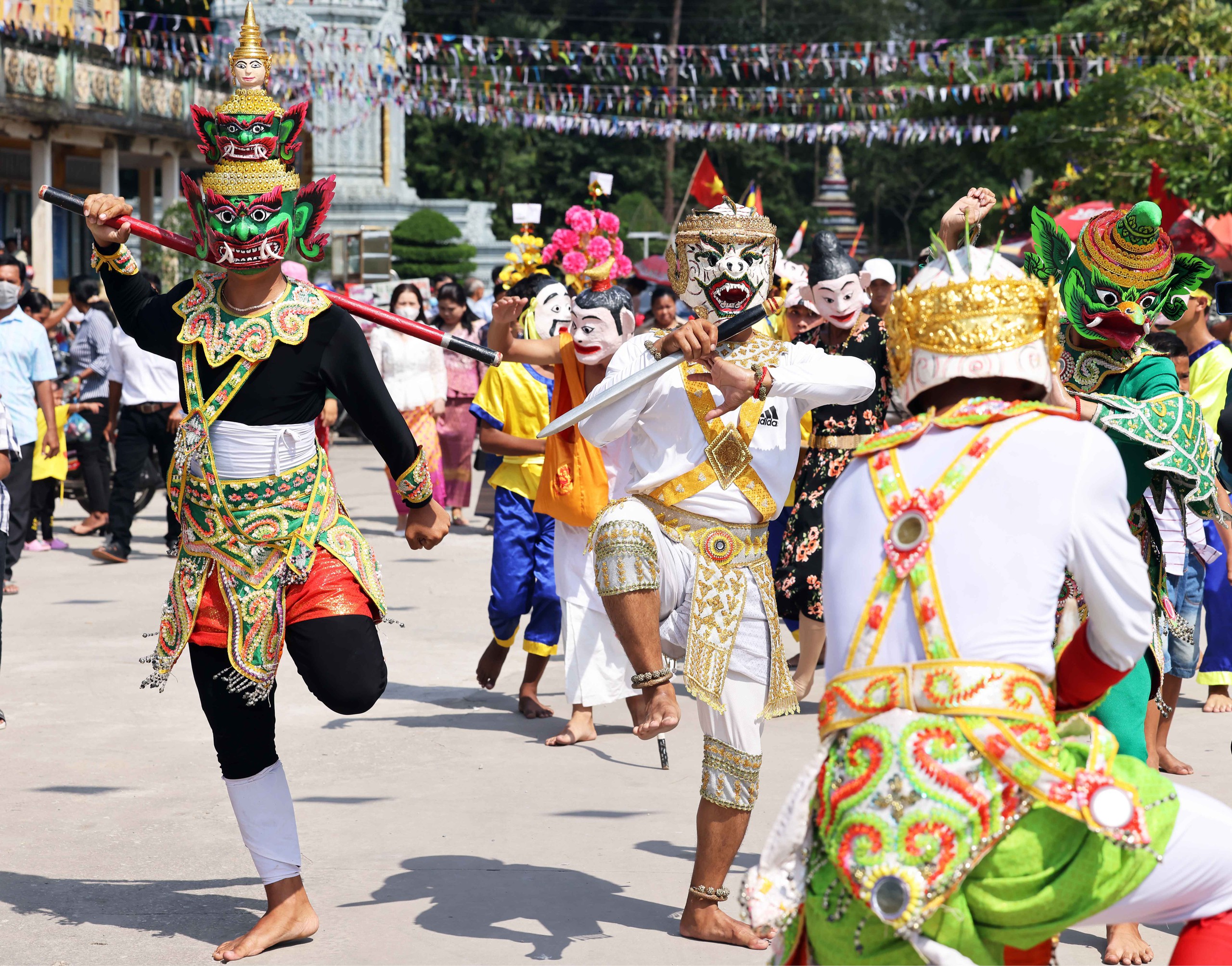 Nhiều hình tượng trong truyền thuyết như Chằn, khỉ Hanuman… được tạo hình với nhiều màu sắc, vũ đạo độc đáo góp phần tạo không khí vui tươi cho lễ hội Ok Om Bok của đồng bào Khmer tại chùa Bôtum Vong Sa Som Rong.