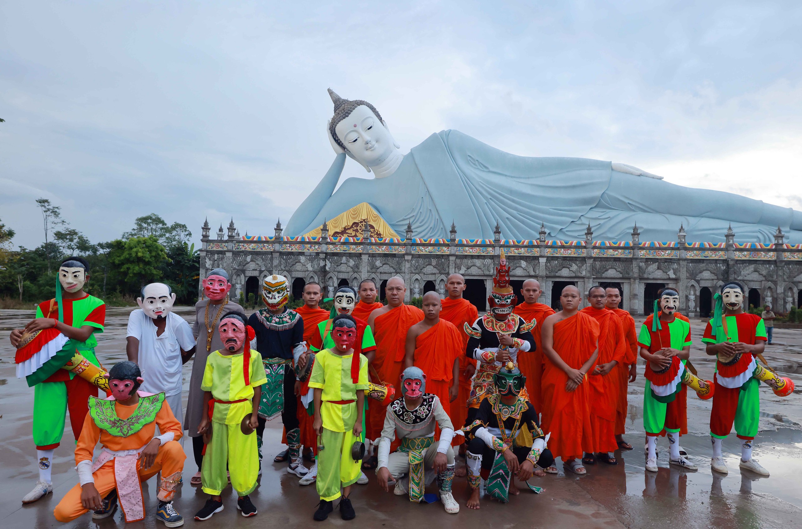 Các thành viên đội vũ kịch dân gian người Khmer chụp hình cùng Thượng tọa Lý Minh Đức, trụ trì chùa Vong Sa Som Rong (chùa Som Rong) ở tại buổi dâng y Kathina nhân dịp Lễ hội Ok Om Bok.