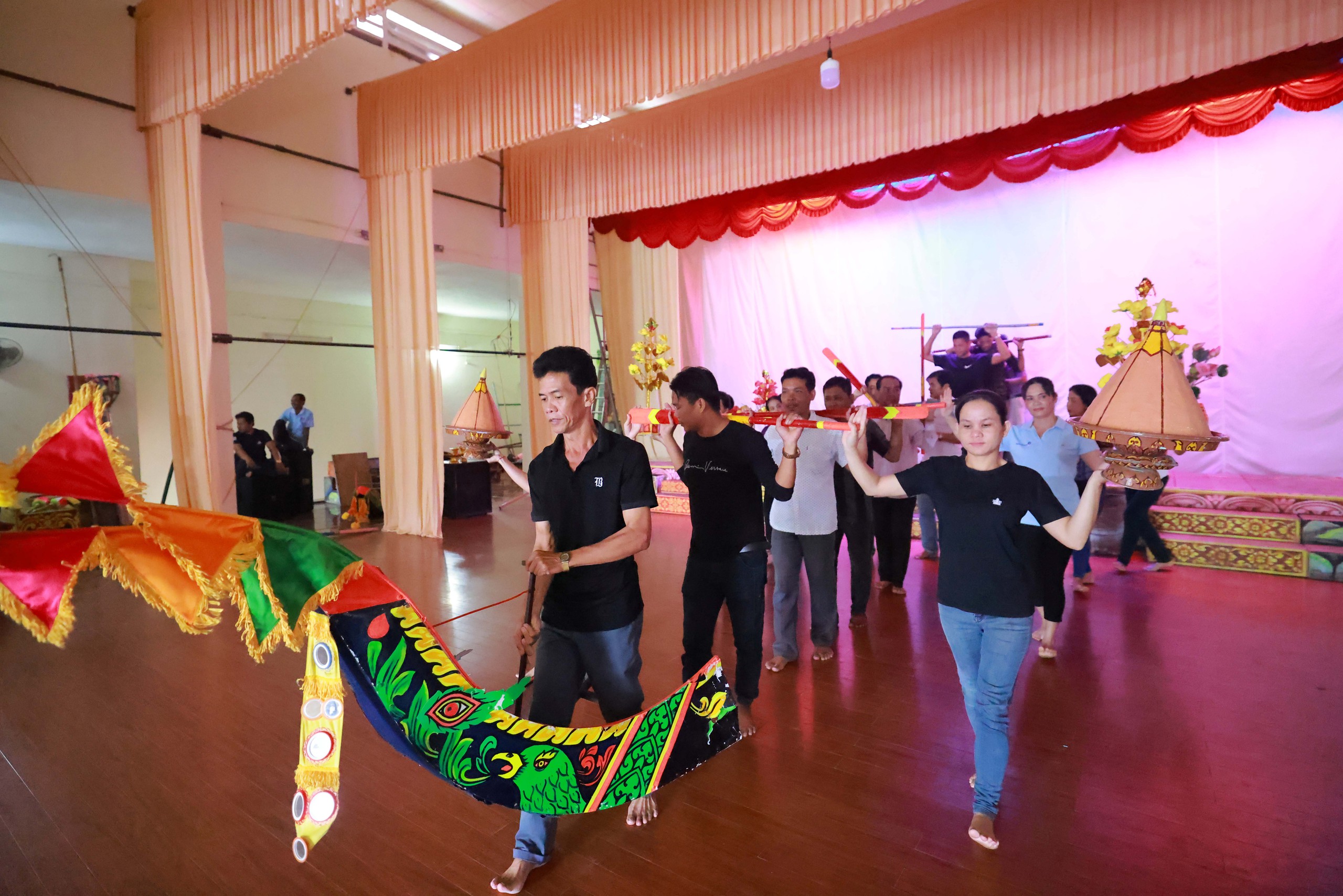 Các nghệ sĩ, diễn viên, nhạc công, hậu trường hết mình tập trên sân khấu, thậm chí mang cả con trẻ lên sàn tập, chuẩn bị cho các tiết mục nghệ thuật, biểu diễn phục vụ bà con Khmer.