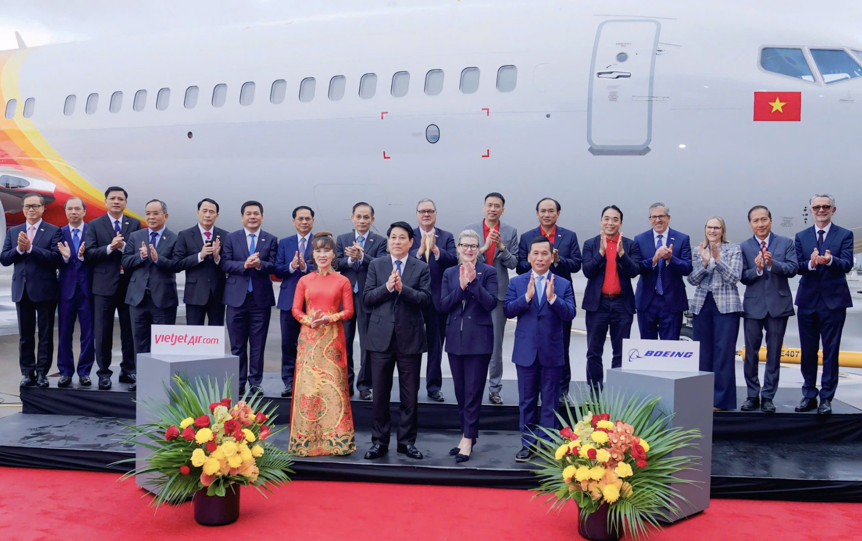 Lễ bàn giao tàu bay 737-8 đầu tiên giữa Boeing và Vietjet với sự chứng kiến của Chủ tịch nước Lương Cường tại Seattle, Hoa Kỳ (21/9/2025). Chiếc tàu bay này nằm trong hợp đồng 200 tàu bay trị giá 32 tỷ USD – đơn hàng hàng không lớn nhất giữa Việt Nam và Hoa Kỳ.