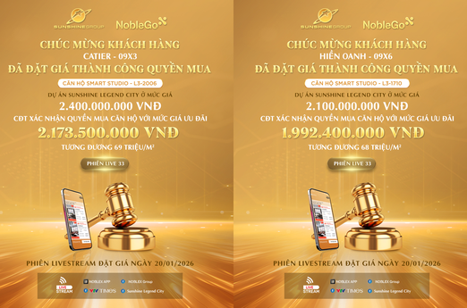 Thị trườngLivestream NobleGo tối 20/1 của Sunshine Group đã mang đến một diễn biến "đi ngược thị trường" hiếm thấy: Quyền mua căn hộ Studio tại Sunshine Legend City được chốt ở mức chỉ 68 và 69 triệu đồng/m2, thấp hơn đáng kể so với mức giá mà chính khách hàng sẵn sàng trả trước đó nhờ chính sách ưu đãi trực tiếp từ Sunshine Group.