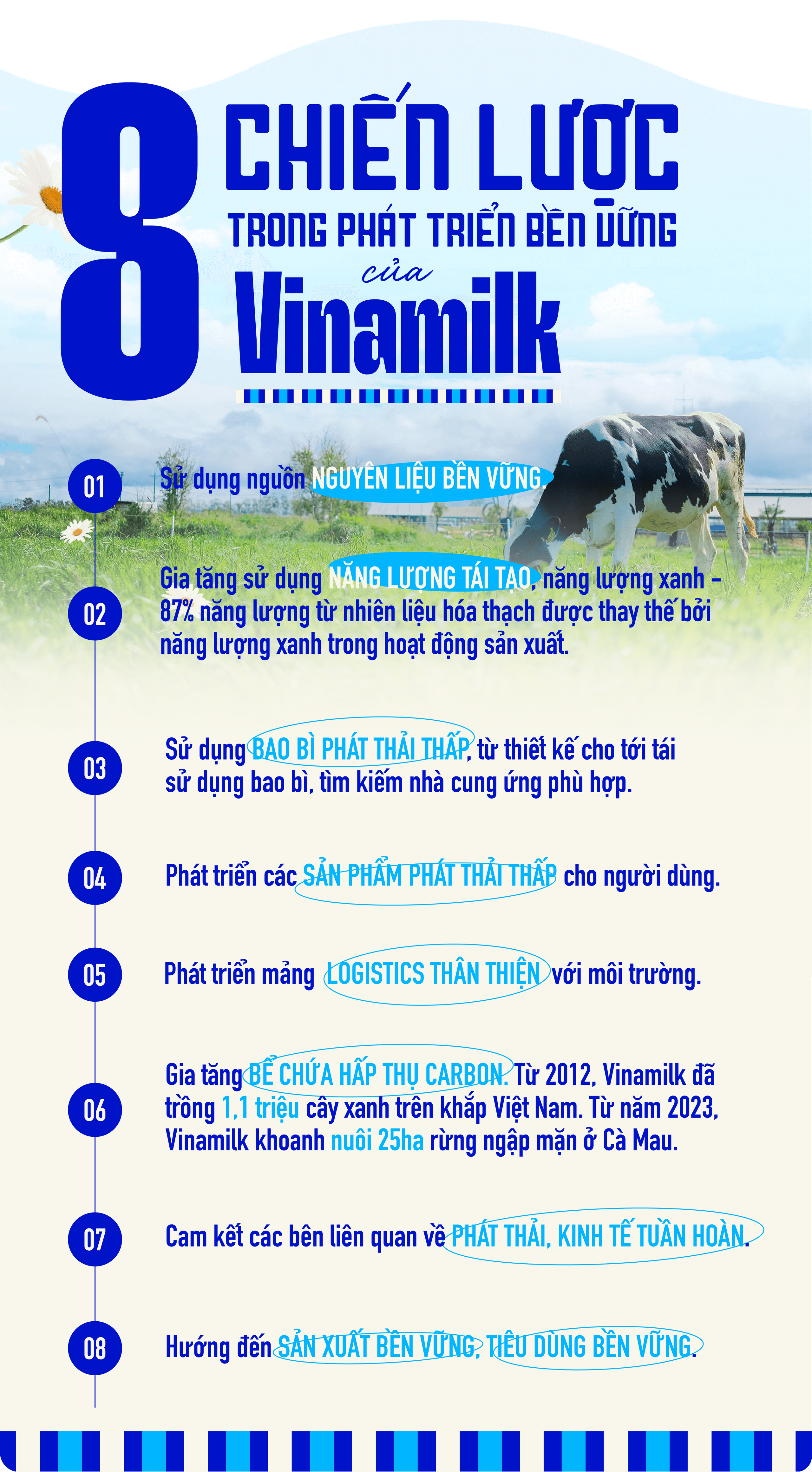 Năm 2023, Vinamilk tiếp tục tạo nên một dấu ấn mạnh mẽ trên hành trình phát triển bền vững khi công bố lộ trình "Vinamilk Pathway to Dairy Net Zero 2050". Đây không chỉ là một tuyên bố mang tính hình thức, mà là một cam kết đầy tham vọng, thể hiện tầm nhìn chiến lược của doanh nghiệp trong việc giảm thiểu tác động đến môi trường. Lộ trình này đặt ra những mục tiêu cụ thể và rõ ràng: giảm 15% lượng phát thải khí nhà kính vào năm 2027, 55% vào năm 2035, và hướng tới mục tiêu phát thải ròng bằng 0 vào năm 2050.