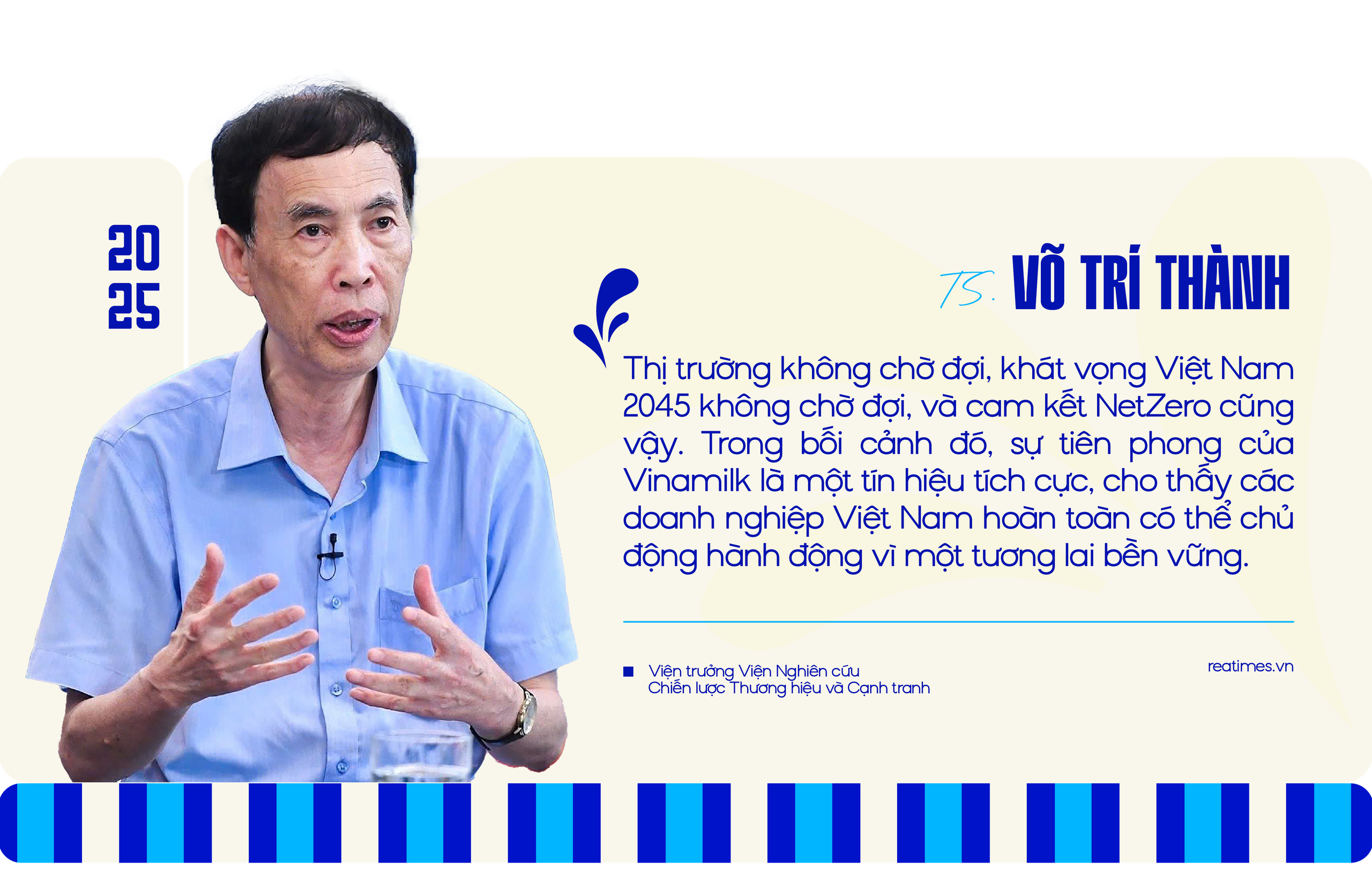 "Chúng ta có thể chờ đợi đến bao giờ? Thị trường không chờ đợi, khát vọng Việt Nam 2045 không chờ đợi, và cam kết NetZero cũng vậy. Trong bối cảnh đó, sự tiên phong của Vinamilk từ cách đây mười mấy năm là một tín hiệu tích cực, cho thấy các doanh nghiệp Việt Nam hoàn toàn có thể chủ động hành động vì một tương lai bền vững", chuyên gia khẳng định.
