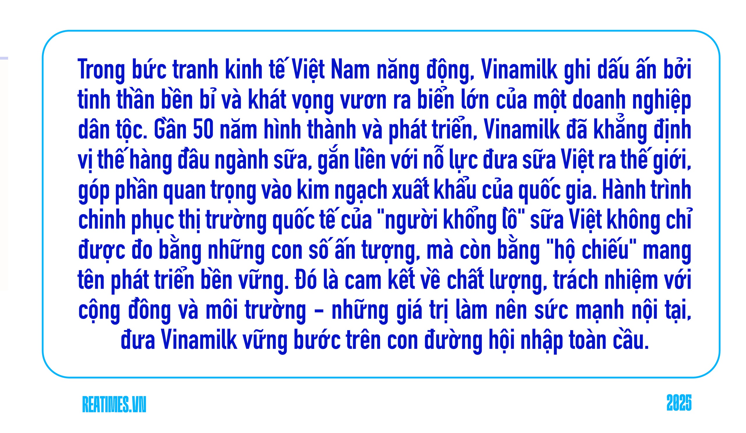 Với bản lĩnh tiên phong đã được chứng minh qua thời gian, Vinamilk không chỉ góp phần khẳng định vị thế ngày càng vững chắc của ngành sữa Việt Nam trên bản đồ thế giới, mà còn kiến tạo nên một hình ảnh đẹp về một doanh nghiệp Việt Nam năng động, sáng tạo và có trách nhiệm.