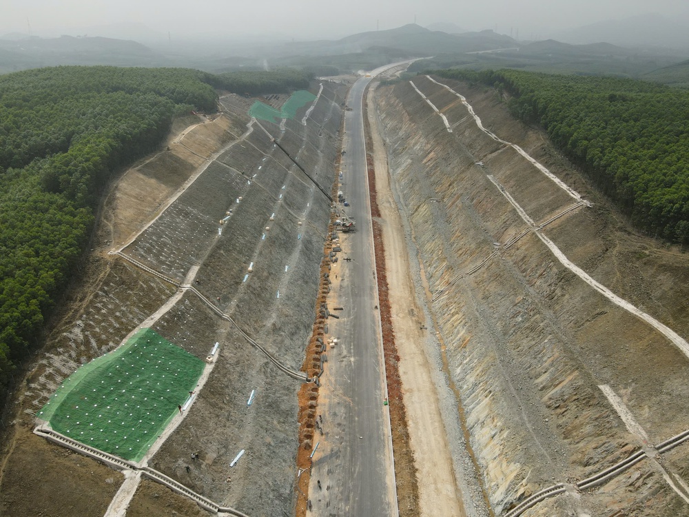 Cao tốc qua Hà Tĩnh đi qua những ngọn đồi cao 40-60m, đòi hỏi nhà thầu phải triển khai nhiều giải pháp thi công theo đúng thiết kế kỹ thuật, an toàn và đáp ứng chất lượng yêu cầu đặt ra. Hiện, nhà thầu đã thi công xong phần nền đường, đang gia cố mái ta luy chống đá rơi bằng phương pháp đinh neo kết hợp lưới thép gia cố cường độ cao.