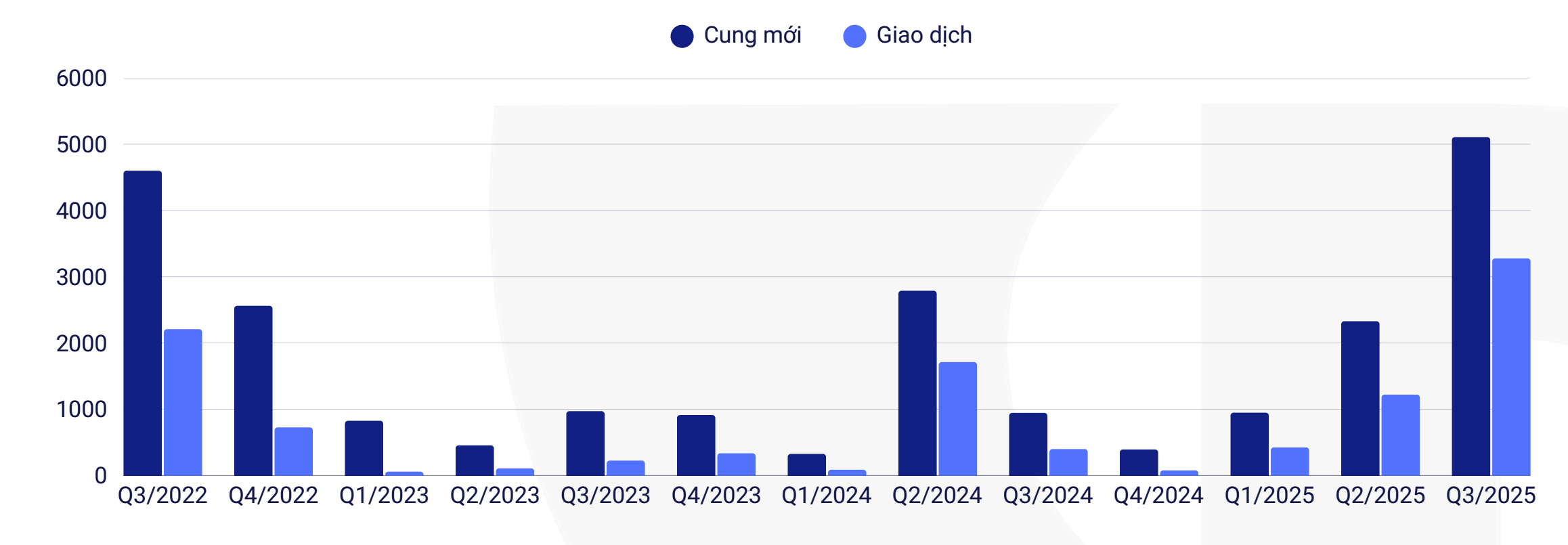 Đến quý III, thị trường có hơn 5.100 sản phẩm mở bán mới, gấp đôi quý II. Tỷ lệ hấp thụ trên nguồn cung mới đạt 64%, tương đương hơn 3.200 giao dịch, tăng 12 điểm phần trăm theo quý và 20 điểm phần trăm theo năm.