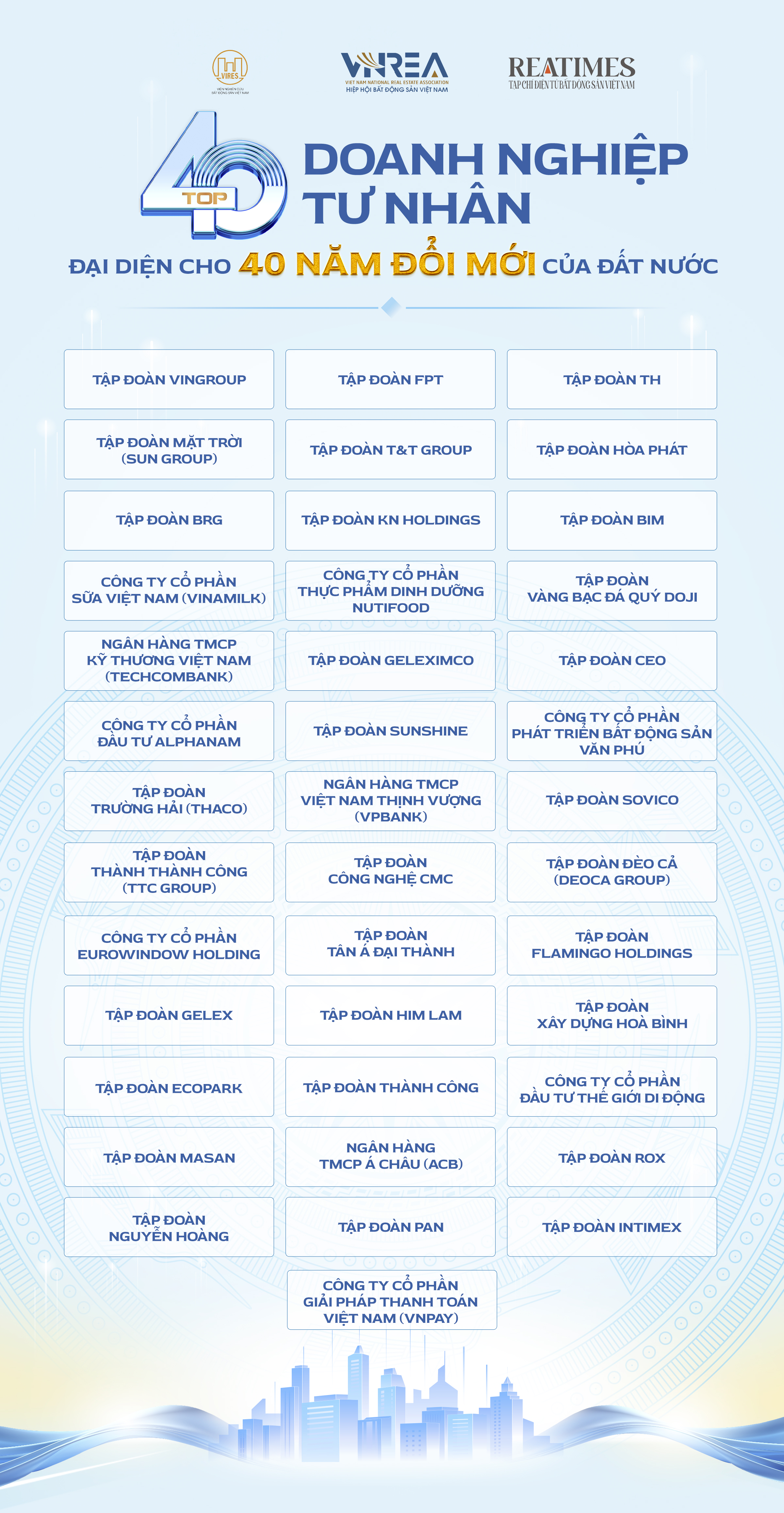Danh sách 40 doanh nghiệp tư nhân tiêu biểu được bình chọn bởi Hội đồng gồm các Đại biểu Quốc hội, thành viên Hội đồng Tư vấn Chính sách của Thủ tướng Chính phủ, các chuyên gia đầu ngành, lãnh đạo Hiệp hội Bất động sản Việt Nam và lãnh đạo các cơ quan báo chí. Với tinh thần độc lập, khách quan, công tâm và trách nhiệm, Hội đồng đã làm việc nghiêm túc, dựa trên hệ thống tiêu chí đánh giá toàn diện về quy mô, năng lực cạnh tranh, đổi mới sáng tạo, trách nhiệm xã hội và đóng góp cho sự phát triển bền vững quốc gia.