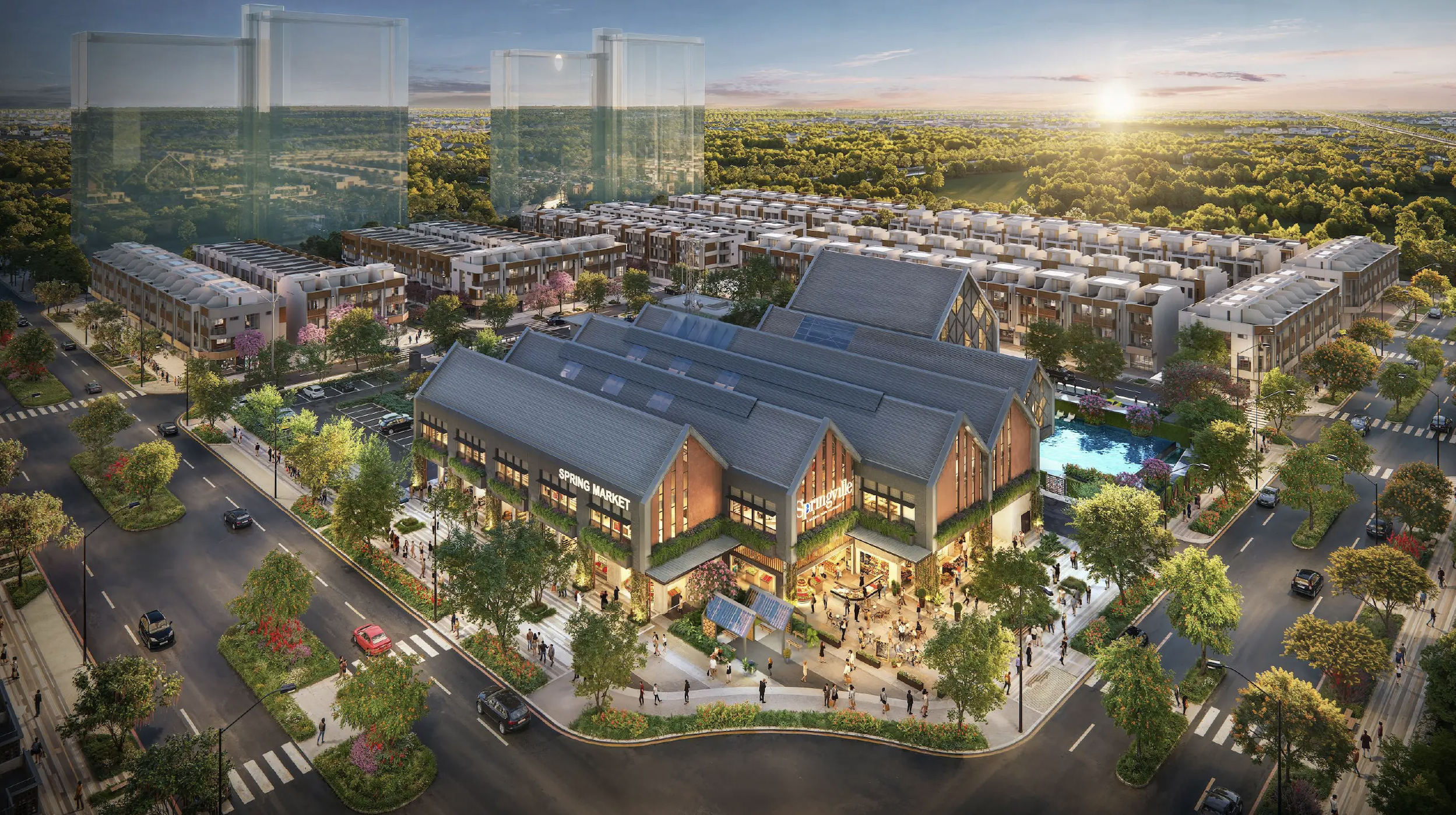 Spring Ville là khu đô thị tích hợp chuẩn quốc tế được xây dựng trên quy mô 18,2 ha, cung cấp cho thị trường gần 2.000 sản phẩm đa dạng chủng loại bao gồm nhà phố, shophouse, khu phức hợp căn hộ cao tầng đa tiện ích. Đáng chú ý nhất trong đó, chính là phân khu chức năng thương mại với “hạt nhân” là chợ và trung tâm dịch vụ giải trí, cùng những con phố mua sắm bao quanh ở trung tâm khuôn viên dự án.