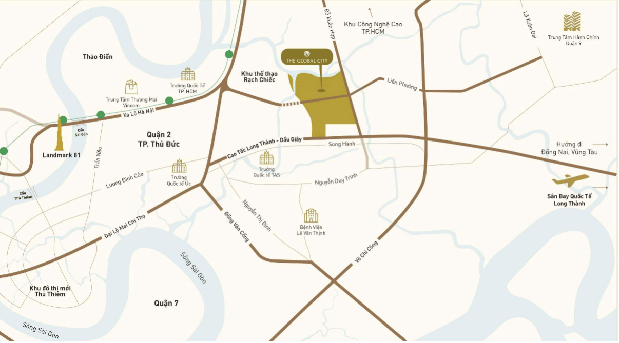 The Global City – khu đô thị phức hợp chuẩn quốc tế tại trung tâm TP.HCM, được kiến tạo dành cho cộng đồng cư dân toàn cầu. Là biểu tượng đầu tiên tại Việt Nam do Foster+Partners – công ty kiến trúc hàng đầu thế giới đến từ Anh Quốc – thiết kế tổng thể, The Global City trải rộng trên diện tích 117,4ha, tọa lạc giữa “trái tim” đô thị mới TP.HCM, được quy hoạch bài bản theo mô hình sống – làm việc – giải trí với hệ thống tiện ích đồng bộ. Xen kẽ giữa các khu căn hộ cao tầng, thấp tầng và biệt thự là không gian trường học, y tế, hành chính và trung tâm thương mại – tất cả hòa quyện để tạo nên một nhịp sống hiện đại, kết nối và bền vững.