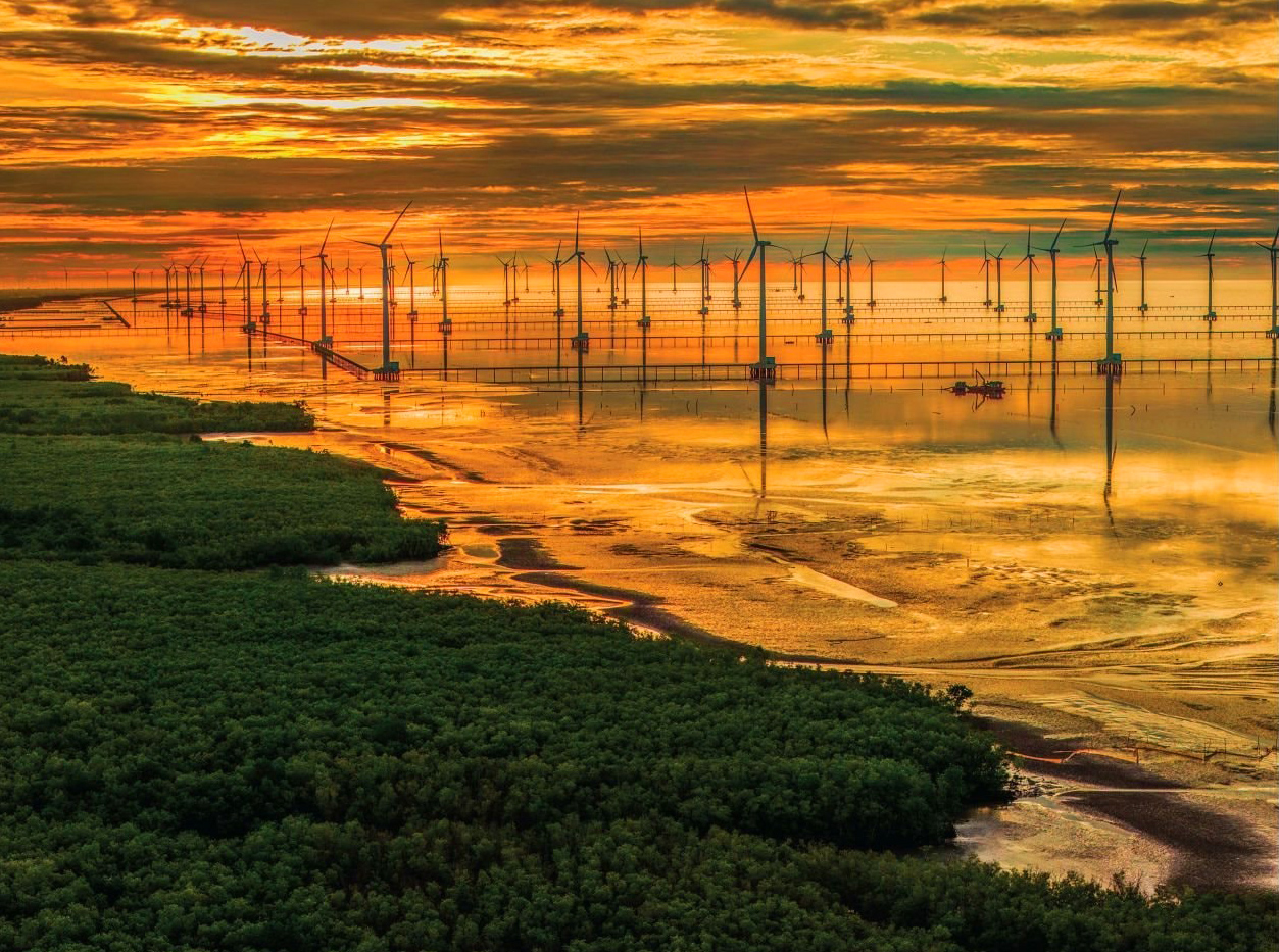 Bình minh trên cánh đồng điện gió ở tỉnh Cà Mau. (Ảnh: nhiepanhdoisong.vn)