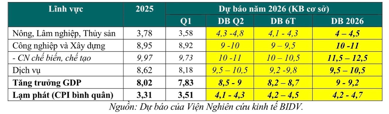 Bảng 1: Dự báo tăng trưởng GDP Việt Nam Quý 2, 6 tháng và cả năm 2026 (Kịch bản cơ sở, % YoY)