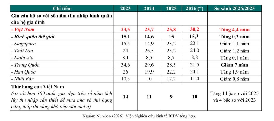 Cụ thể, số năm thu nhập bình quân của hộ gia đình cần để mua một căn hộ tại Việt Nam đã tăng từ 23,5 năm (2023) lên 25,8 năm (2025) và dự kiến khoảng 30,2 năm vào năm 2026, tức tăng thêm khoảng 4,4 năm so với năm 2025. Trong khi đó, mức bình quân của thế giới chỉ khoảng 15 - 15,3 năm và gần như không biến động đáng kể.