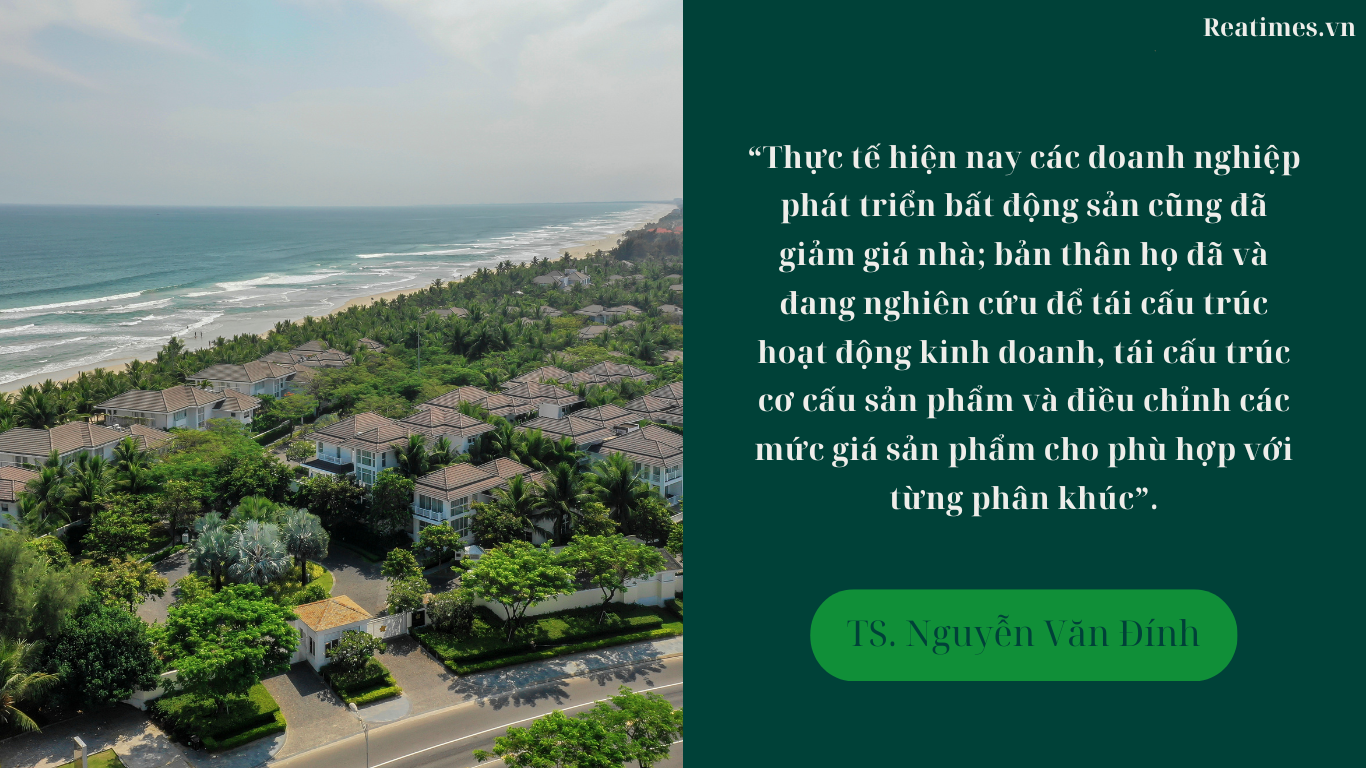 TS. Nguyễn Văn Đính: Thực tế hiện nay các doanh nghiệp phát triển bất động sản cũng đã giảm giá nhà; bản thân họ đã và đang nghiên cứu để tái cấu trúc hoạt động kinh doanh, tái cấu trúc cơ cấu sản phẩm và điều chỉnh các mức giá sản phẩm cho phù hợp với từng phân khúc. Nhưng hầu hết các sản phẩm được tung ra thị trường ở thời điểm hiện tại đều là sản phẩm từ các dự án cũ, tồn kho, và các sản phẩm mới là rất hiếm. Áp lực từ chênh lệch cung cầu buộc chủ đầu tư phải đưa ra những ưu đãi như tăng chiết khấu, nới tiến độ thanh toán…